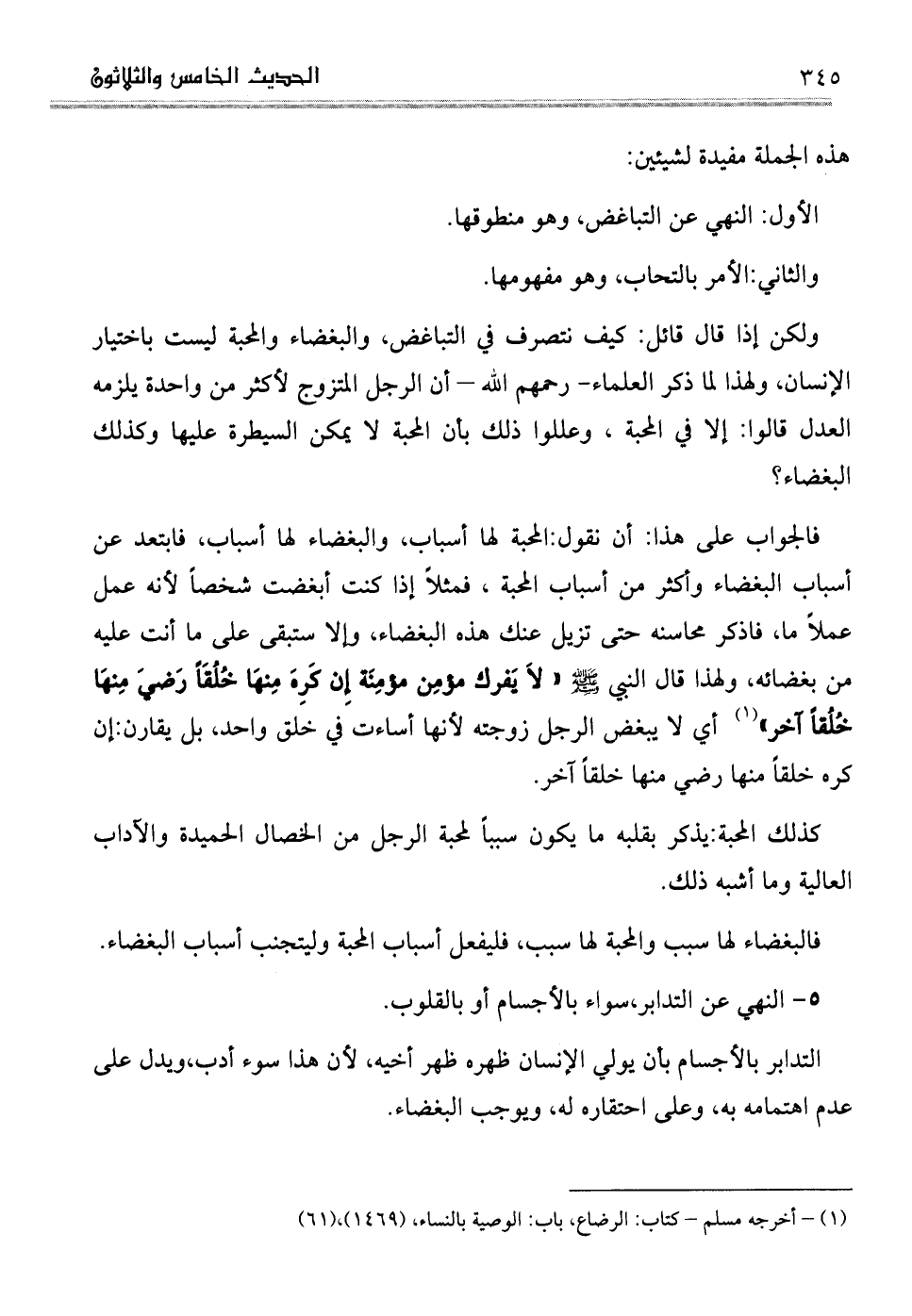 ولكن إذا قال قائل: كيف نتصرف في التباغض، والبغضاء والمحبة ليست باختيار الإنسان، ولهذا لما ذكر العلماء- رحمهم الله - أن الرجل المتزوج لأكثر من واحدة يلزمه العدل قالوا: إلا في المحبة، وعللوا ذلك بأن المحبة لا يمكن السيطرة عليها وكذلك البغضاء؟