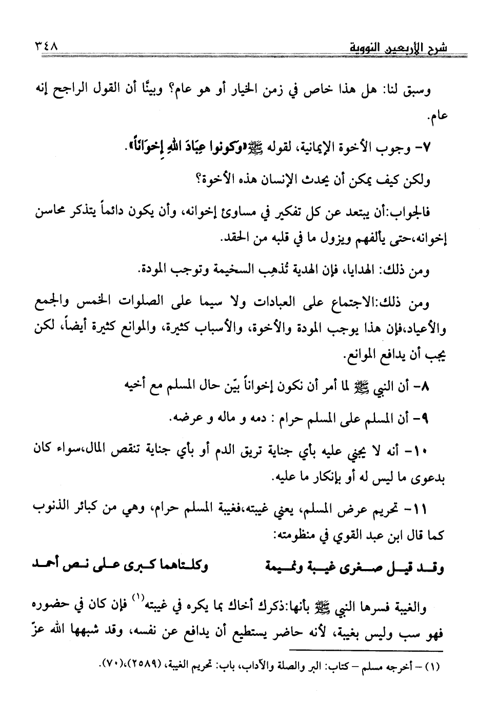 . 7وجوب الأخوة الإيمانية، لقوله صلى الله عليه وسلم "وَكونوا عِبَادَ اللهِ إِخوَانَاً".