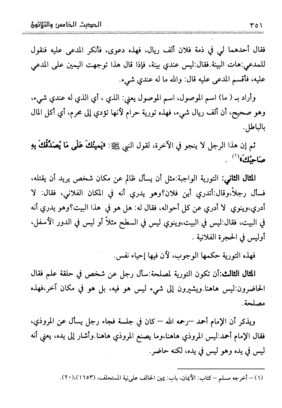 المثال الثاني: التورية الواجبة: مثل أن يسأل ظالم عن مكان شخص يريد أن يقتله، فسأل رجلاً، وقال: أتدري أين فلان؟ وهو يدري أنه في المكان الفلاني، فقال: لا أدري، وينوي لا أدري عن كل أحواله، فقال له: هل هو في هذا البيت؟ وهو يدري أنه في البيت، فقال: ليس في البيت، وينوي ليس في السطح مثلاً أو ليس في الدور الأسفل، أوليس في الحجرة الفلانية.