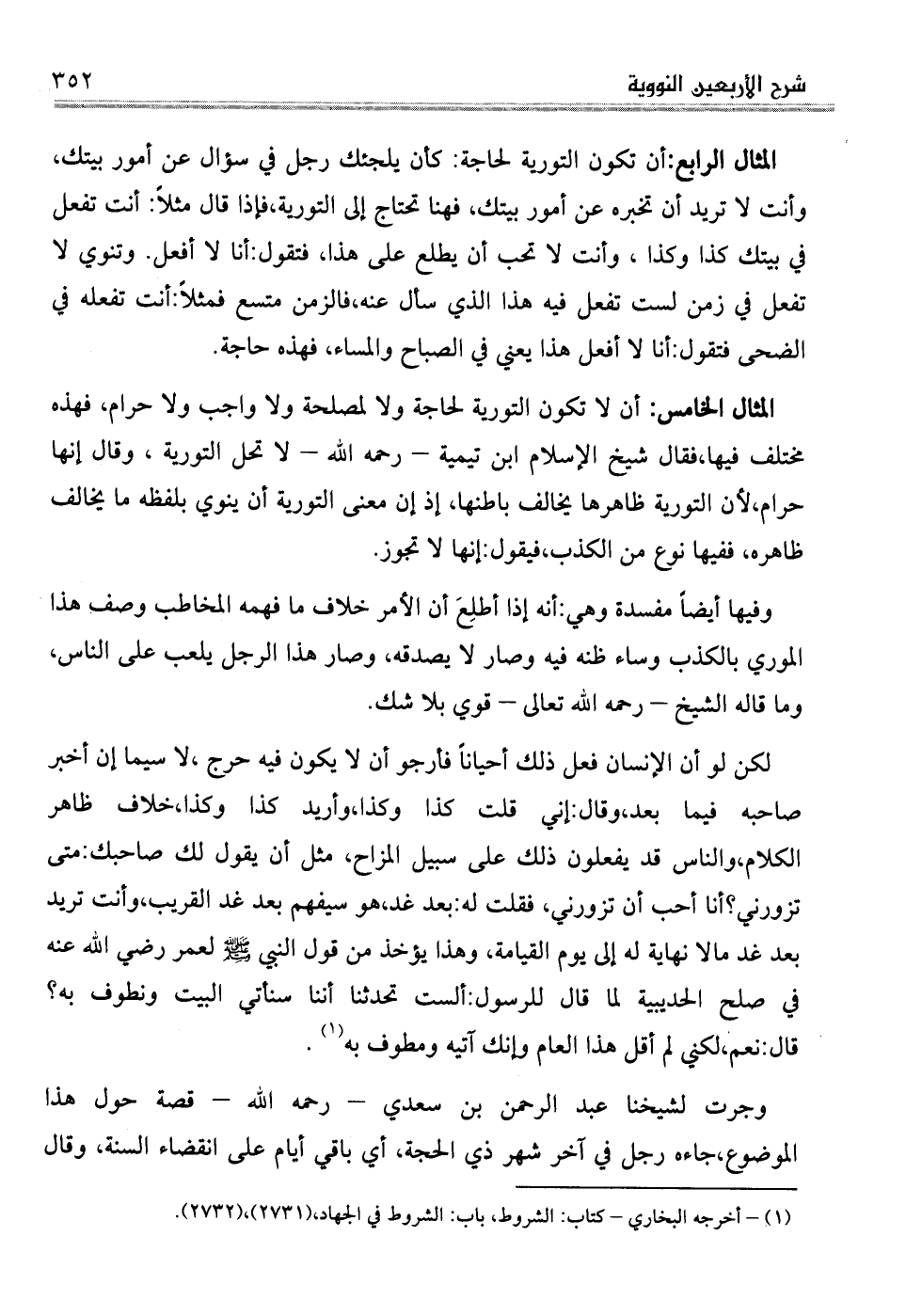 لكن لو أن الإنسان فعل ذلك أحياناً فأرجو أن لا يكون فيه حرج، لا سيما إن أخبر صاحبه فيما بعد، وقال: إني قلت كذا وكذا، وأريد كذا وكذا، خلاف ظاهر الكلام، والناس قد يفعلون ذلك على سبيل المزاح، مثل أن يقول لك صاحبك: متى تزورني؟ أنا أحب أن تزورني، فقلت له: بعد غد، هو سيفهم بعد غد القريب، وأنت تريد بعد غد مالا نهاية له إلى يوم القيامة، وهذا يؤخذ من قول النبي صلى الله عليه وسلم لعمر رضي الله عنه في صلح الحديبية لما قال للرسول صلى الله عليه وسلم: ألست تحدثنا أننا سنأتي البيت ونطوف به؟ قال: نعم، لكني لم أقل هذا العام وإنك آتيه ومطوف به (¬1) .