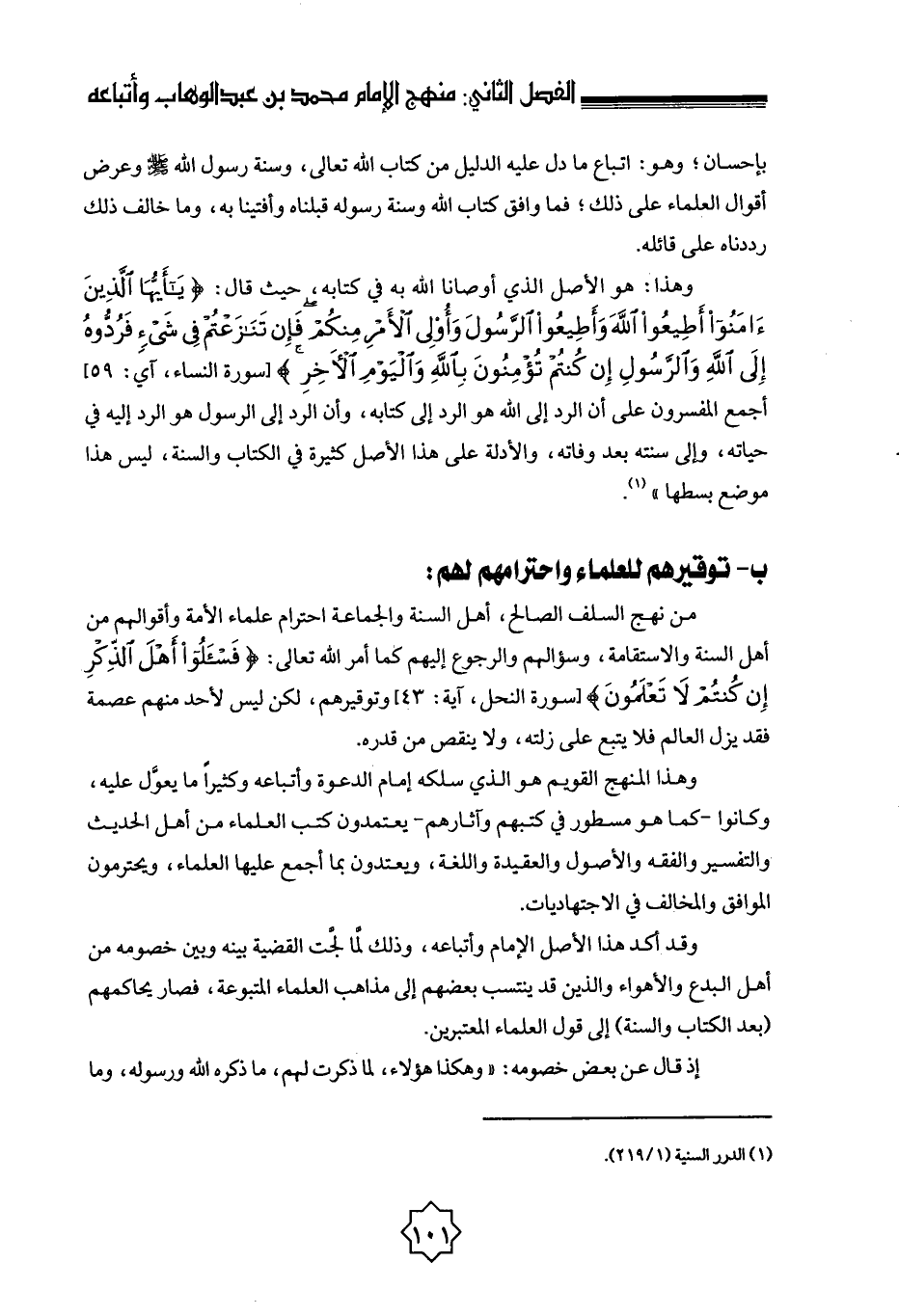 وهذا المنهج القويم هو الذي سلكه إمام الدعوة وأتباعه وكثيرًا ما يعوَّل عليه، وكانوا - كما هو مسطور في كتبهم وآثارهم - يعتمدون كتب العلماء من أهل الحديث والتفسير والفقه والأصول والعقيدة واللغة، ويعتدون بما أجمع عليها العلماء، ويحترمون الموافق والمخالف في الاجتهاديات.