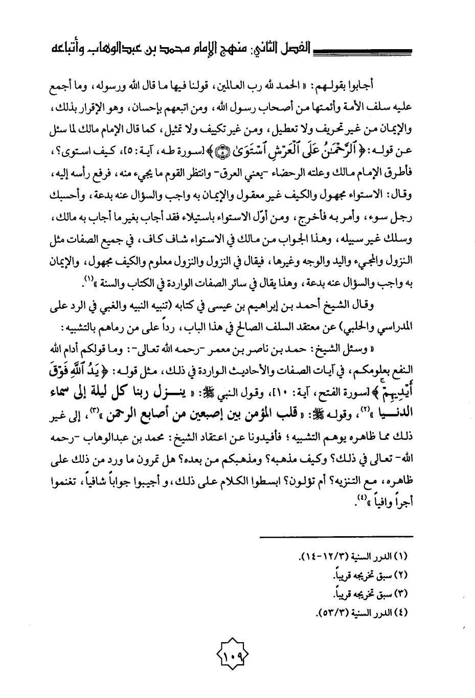 «وسئل الشيخ: حمد بن ناصر بن معمر - رحمه الله تعالى -: وما قولكم أدام الله النفع بعلومكم، في آيات الصفات والأحاديث الواردة في ذلك، مثل قوله: {يَدُ اللَّهِ فَوْقَ أَيْدِيهِمْ} [الفتح: 10] [سورة الفتح، آية: 10] ، وقول النبي صلى الله عليه وسلم: «ينزل ربنا كل ليلة إلى سماء الدنيا» (¬2) وقوله صلى الله عليه وسلم: «قلب المؤمن بين إصبعين من أصابع الرحمن» (¬3) إلى غير ذلك مما ظاهره يوهم التشبيه؛ فأفيدونا عن اعتقاد الشيخ محمد بن عبد الوهاب - رحمه الله - تعالى في ذلك؟ وكيف مذهبه؟ ومذهبكم من بعده؟ هل تمرون ما ورد من ذلك على ظاهره، مع التنزيه؟ أم تؤولون؟ ابسطوا الكلام على ذلك، وأجيبوا جوابًا شافياً، تغنموا أجرًا وافيًا» (¬4) .