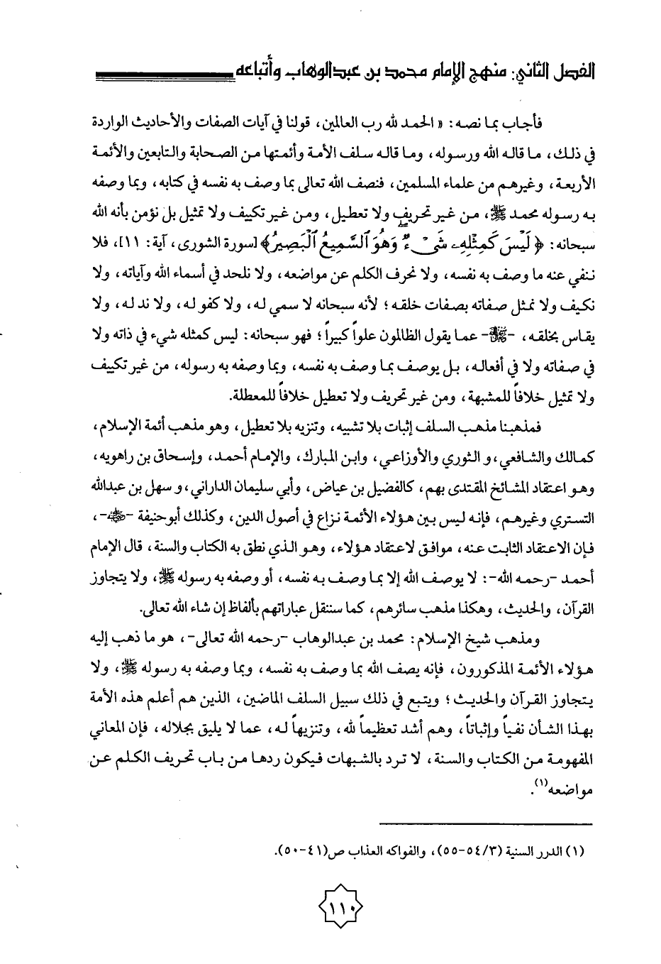 ومذهب شيخ الإسلام محمد بن عبد الوهاب - رحمه الله تعالى - هو ما ذهب إليه هؤلاء الأئمة المذكورون، فإنه يصف الله بما وصف به نفسه، وبما وصفه به رسوله صلى الله عليه وسلم، ولا يتجاوز القرآن والحديث، ويتبع في ذلك سبيل السلف الماضين، الذين هم أعلم هذه الأمة بهذا الشأن نفيًا وإثباتاً، وهم أشد تعظيمًا لله، وتنزيهًا له عما لا يليق بجلاله، فإن المعاني المفهومة من الكتاب والسنة لا ترد بالشبهات فيكون ردها من باب تحريف الكلم عن مواضعه (¬1) .