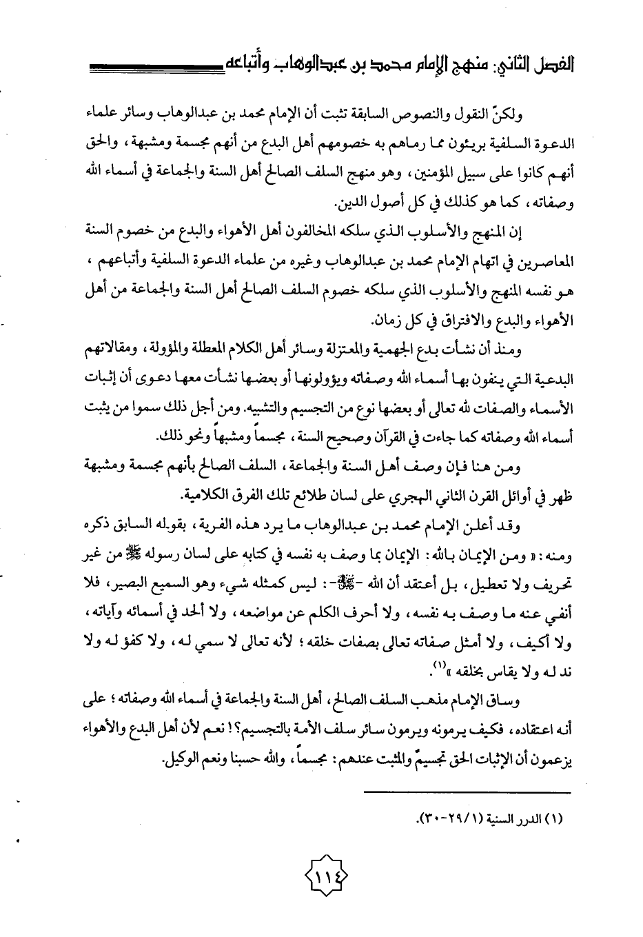 ولكنّ النقول والنصوص السابقة تثبت أن الإمام محمد بن عبد الوهاب وسائر علماء الدعوة السلفية بريئون مما رماهم به خصومهم أهل البدع من أنهم مجسمة ومشبهة، والحق أنهم كانوا على سبيل المؤمنين، وهو منهج السلف الصالح أهل السنة والجماعة في أسماء الله وصفاته، كما هو كذلك في كل أصول الدين.