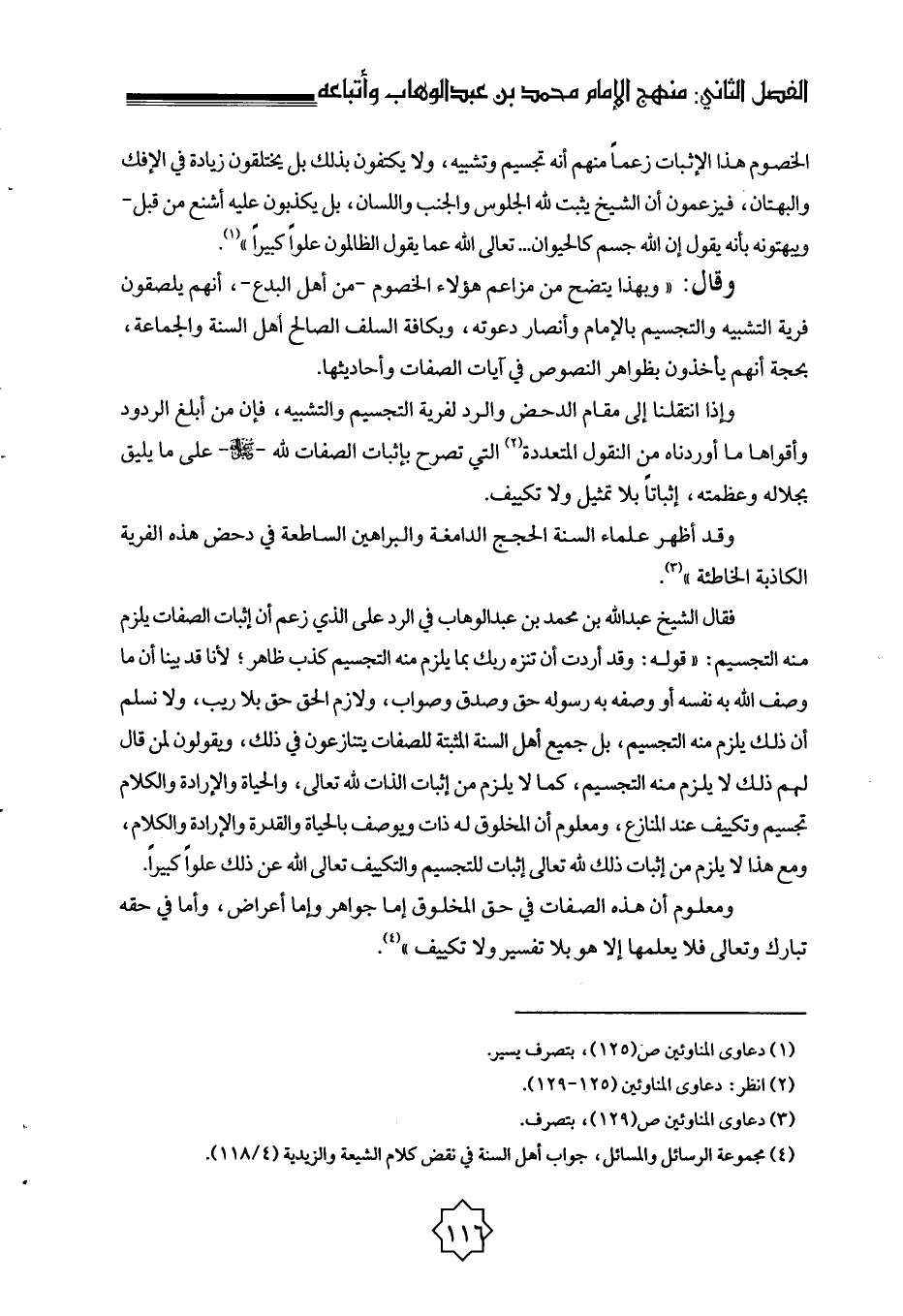 وقال: «وبهذا يتضح من مزاعم هؤلاء الخصوم - من أهل البدع - أنهم يلصقون فرية التشبيه والتجسيم بالإمام وأنصار دعوته، وبكافة السلف الصالح أهل السنة والجماعة، بحجة أنهم يأخذون بظواهر النصوص في آيات الصفات وأحاديثها.