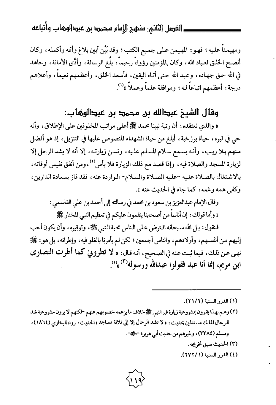 وقال الشيخ عبد الله بن محمد بن عبد الوهاب: «والذي نعتقده: أن رتبة نبينا محمد صلى الله عليه وسلم أعلى مراتب المخلوقين على الإطلاق، وأنه حي في قبره، حياة برزخية، أبلغ من حياة الشهداء المنصوص عليها في التنزيل، إذ هو أفضل منهم بلا ريب، وأنه يسمع سلام المسلم عليه، وتسن زيارته، إلا أنه لا يشد الرحل إلا لزيارة المسجد والصلاة فيه، وإذا قصد مع ذلك الزيارة فلا بأس (¬2) ومن أنفق نفيس أوقاته، بالاشتغال بالصلاة عليه - عليه الصلاة والسلام - الواردة عنه، فقد فاز بسعادة الدارين، وكفى همه وغمه، كما جاء في الحديث عنه» .