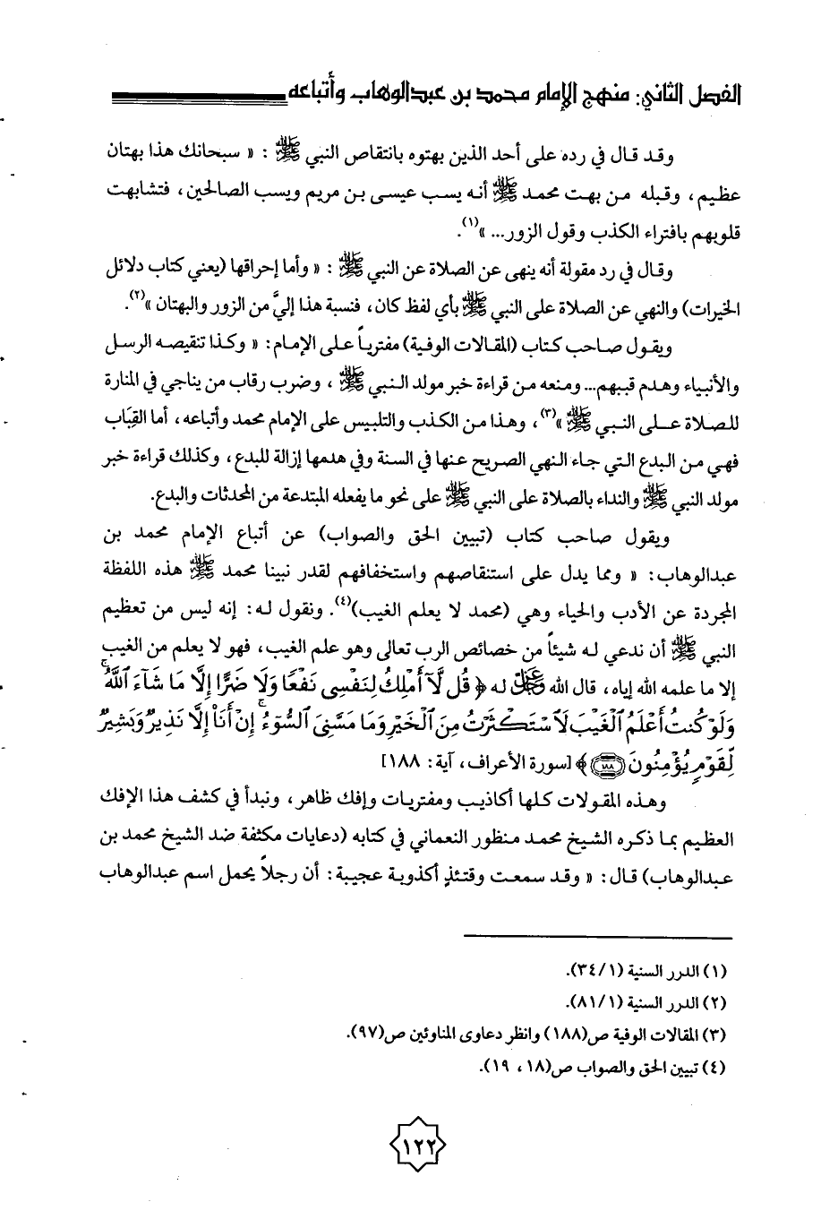 ويقول صاحب كتاب (تبيين الحق والصواب) عن أتباع الإمام محمد بن عبد الوهاب: «ومما يدل على استنقاصهم واستخفافهم لقدر نبينا محمد صلى الله عليه وسلم هذه اللفظة المجردة عن الأدب والحياء وهي (محمد لا يعلم الغيب) (¬4) . ونقول له: إنه ليس من تعظيم النبي صلى الله عليه وسلم أن ندعي له شيئًا من خصائص الرب تعالى وهو علم الغيب، فهو لا يعلم من الغيب إلا ما علمه الله إياه، قال الله عز وجل له {قُلْ لَا أَمْلِكُ لِنَفْسِي نَفْعًا وَلَا ضَرًّا إِلَّا مَا شَاءَ اللَّهُ وَلَوْ كُنْتُ أَعْلَمُ الْغَيْبَ لَاسْتَكْثَرْتُ مِنَ الْخَيْرِ وَمَا مَسَّنِيَ السُّوءُ إِنْ أَنَا إِلَّا نَذِيرٌ وَبَشِيرٌ لِقَوْمٍ يُؤْمِنُونَ} [الأعراف: 188] [سورة الأعراف، آية: 188] .