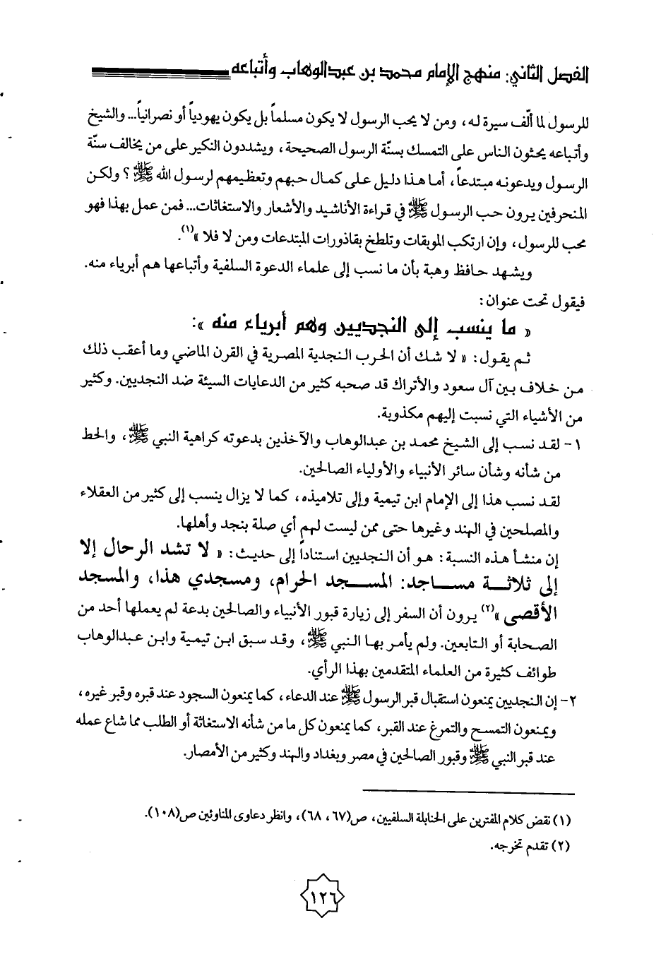 إن منشأ هذه النسبة هو أن النجديين استنادًا إلى حديث: «لا تشد الرحال إلا إلى ثلاثة مساجد: المسجد الحرام، ومسجدي هذا، والمسجد الأقصى» (¬2) يرون أن السفر إلى زيارة قبور الأنبياء والصالحين بدعة لم يعملها أحد من الصحابة أو التابعين، ولم يأمر بها النبي صلى الله عليه وسلم، وقد سبق ابن تيمية وابن عبد الوهاب طوائف كثيرة من العلماء المتقدمين بهذا الرأي.