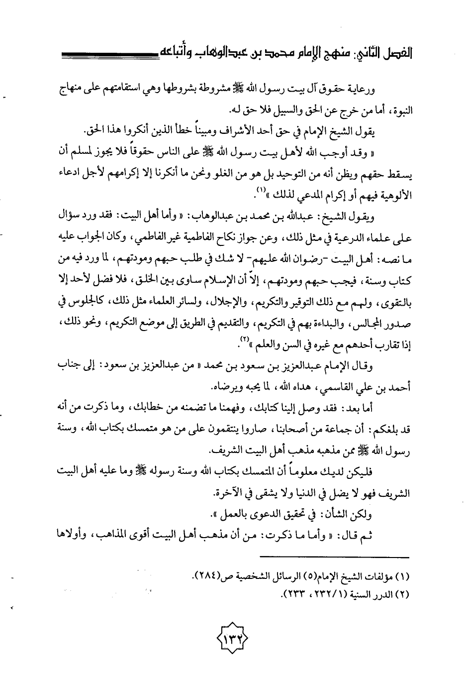 ويقول الشيخ: عبد الله بن محمد بن عبد الوهاب: «وأما أهل البيت: فقد ورد سؤال على علماء الدرعية في مثل ذلك، وعن جواز نكاح الفاطمية غير الفاطمي، وكان الجواب عليه ما نصه: أهل البيت - رضوان الله عليهم - لا شك في طلب حبهم ومودتهم، لما ورد فيه من كتاب وسنة، فيجب حبهم ومودتهم، إلا أن الإسلام ساوى بين الخلق، فلا فضل لأحد إلا بالتقوى، ولهم مع ذلك التوقير والتكريم، والإجلال، ولسائر العلماء مثل ذلك، كالجلوس في صدور المجالس، والبداءة بهم في التكريم، والتقديم في الطريق إلى موضع التكريم، ونحو ذلك، إذا تقارب أحدهم مع غيره في السن والعلم» (¬2) .