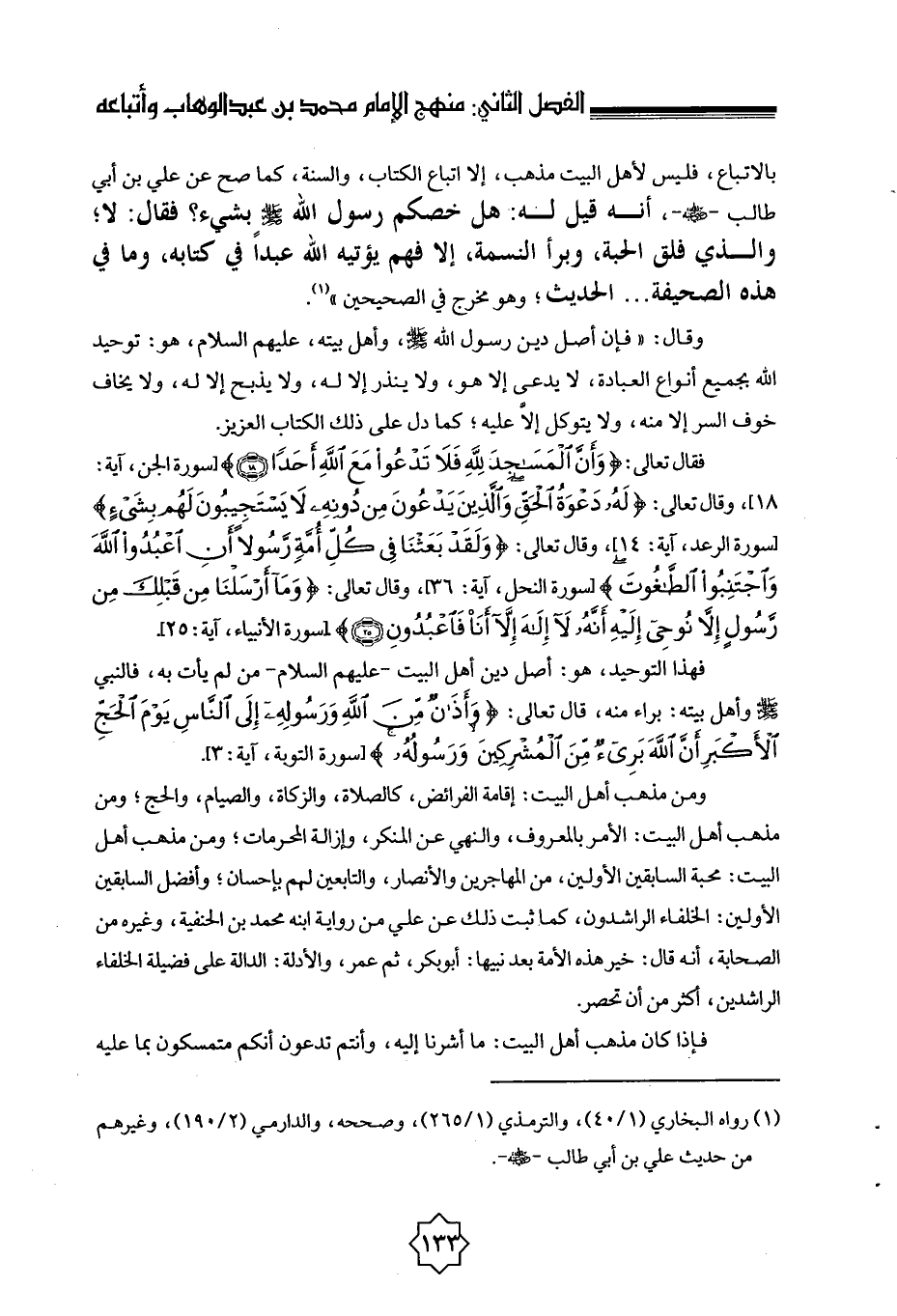 بالاتباع، فليس لأهل البيت مذهب إلا اتباع الكتاب، والسنة، كما صح عن علي بن أبي طالب - رضي الله عنه - «أنه قيل له: هل خصكم رسول الله صلى الله عليه وسلم بشيء؟ فقال: لا، والذي فلق الحبة، وبرأ النسمة، إلا فهم يؤتيه الله عبدًا في كتابه، وما في هذه الصحيفة ... » الحديث؛ وهو مخرج في الصحيحين» (¬1) .