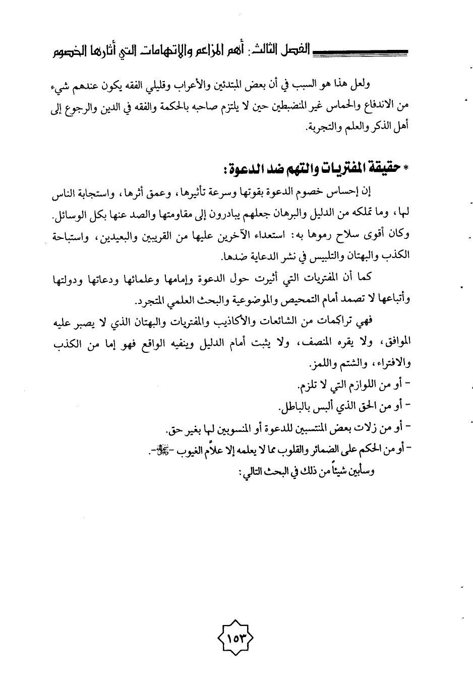 حقيقة المفتريات والتهم ضد الدعوة: إن إحساس خصوم الدعوة بقوتها وسرعة تأثيرها، وعمق أثرها، واستجابة الناس لها، وما تملكه من الدليل والبرهان جعلهم يبادرون إلى مقاومتها والصد عنها بكل الوسائل. وكان أقوى سلاح رموها به استعداء الآخرين عليها من القريبين والبعيدين، واستباحة الكذب والبهتان والتلبيس في نشر الدعاية ضدها.