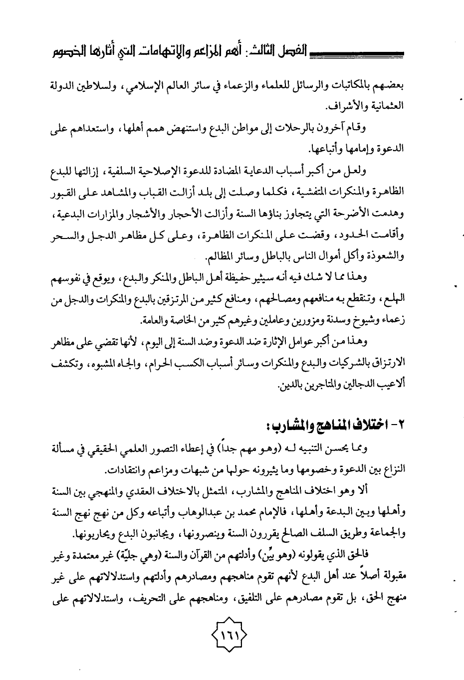 ألا وهو اختلاف المناهج والمشارب، المتمثل بالاختلاف العقدي والمنهجي بين السنة وأهلها وبين البدعة وأهلها، فالإمام محمد بن عبد الوهاب وأتباعه وكل من نهج نهج السنة والجماعة وطريق السلف الصالح يقررون السنة وينصرونها، ويجانبون البدع ويحاربونها.