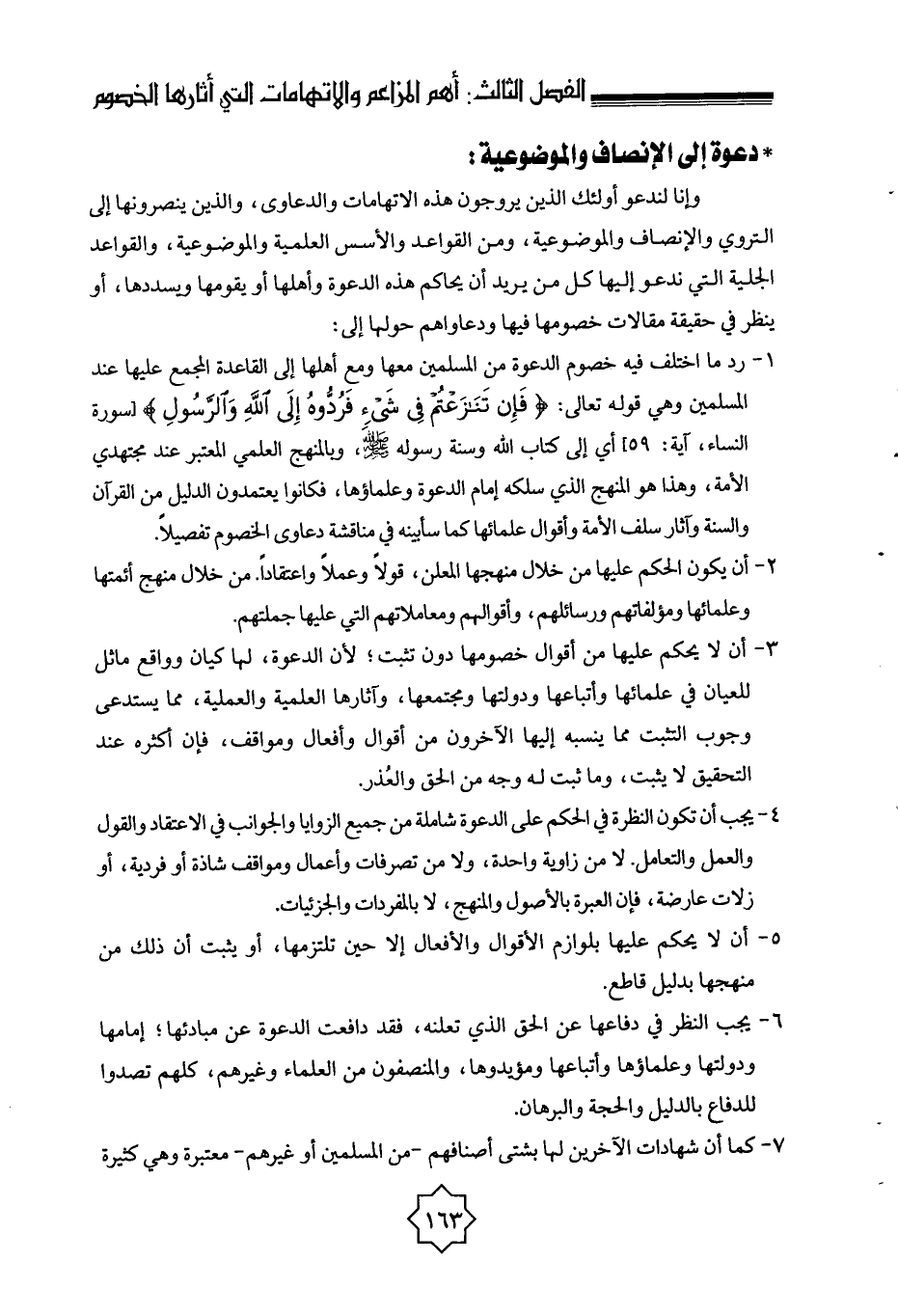 * دعوة إلى الإنصاف والموضوعية: وإنا لندعو أولئك الذين يروجون هذه الاتهامات والدعاوى، والذين ينصرونها إلى التروي والإنصاف والموضوعية، ومن القواعد والأسس العلمية والموضوعية، والقواعد الجلية التي ندعو إليها كل من يريد أن يحاكم هذه الدعوة وأهلها أو يقومها ويسددها، أو ينظر في حقيقة مقالات خصومها فيها ودعاواهم حولها إلى: