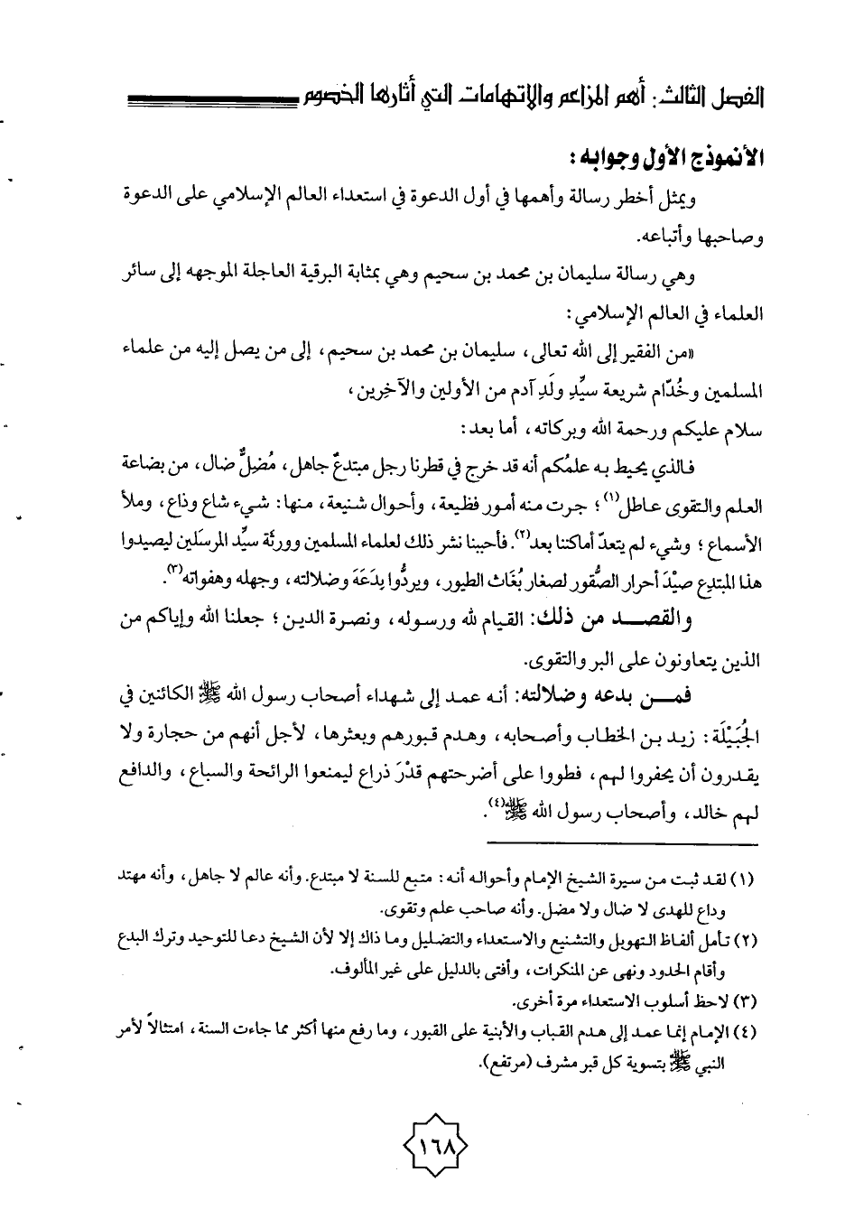 نماذج من المفتريات والاتهامات الأنموذج الأول وجوابه: ويمثل أخطر رسالة وأهمها في أول الدعوة في استعداء العالم الإسلامي على الدعوة وصاحبها وأتباعه.