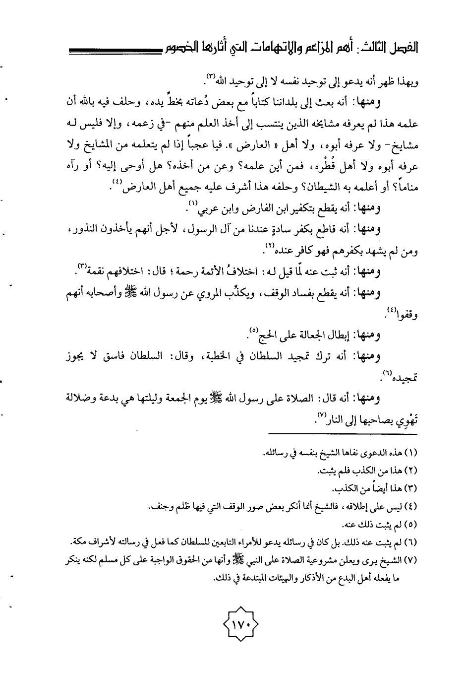 (¬1) هذه فرية صلعاء فإن أشهر ما دعا إليه الشيخ إخلاص التوحيد والعبادة لله وحده، وهذه قضيته الكبرى بإجماع الناس، وهي أبرز ما ينقم عليه خصومه من المدافعين عن الشركيات والبدع ووسائلها وأهلها، فكيف يقال إنه يدعو إلى توحيد نفسه.