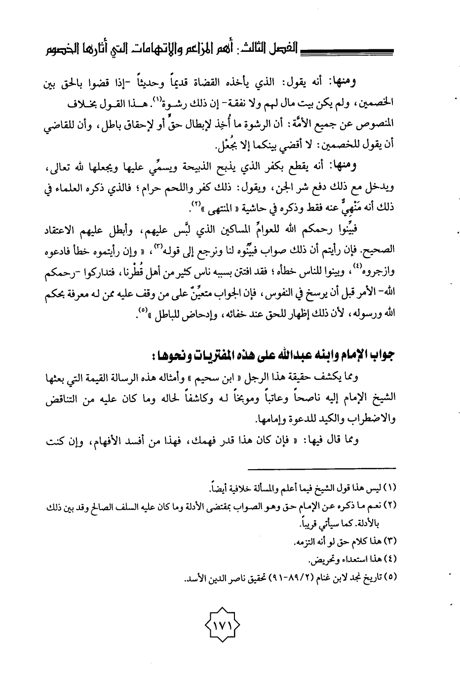 جواب الإمام وابنه عبد الله على هذه المفتريات ونحوها: ومما يكشف حقيقة هذا الرجل «ابن سحيم» وأمثاله هذه الرسالة القيمة التي بعثها الشيخ الإمام إليه ناصحًا وعاتبًا وموبخًا له وكاشفًا لحاله وما كان عليه من التناقض والاضطراب والكيد للدعوة وإمامها.
