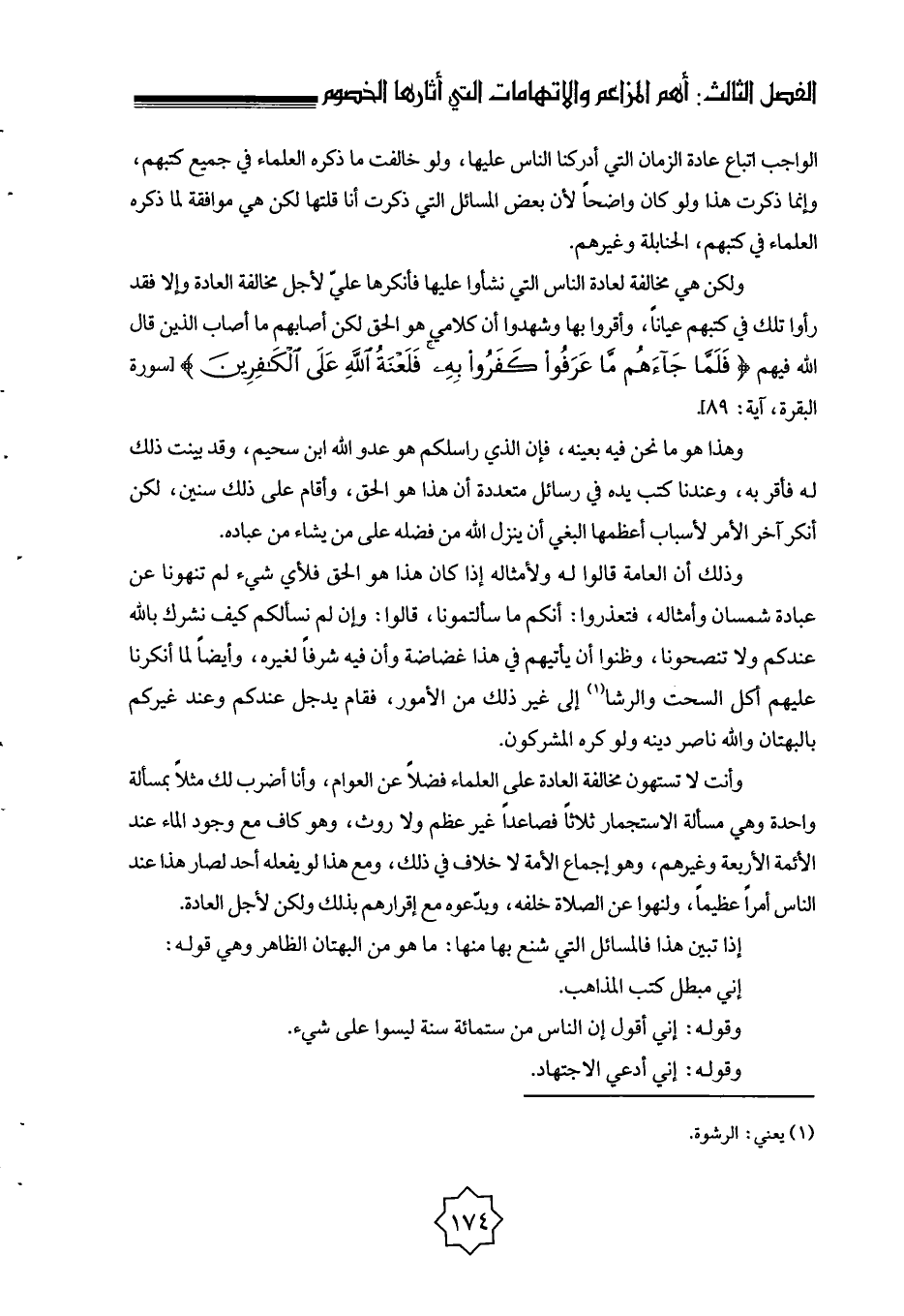 ولكن هي مخالفة لعادة الناس التي نشأوا عليها فأنكرها عليّ لأجل مخالفة العادة وإلا فقد رأوا تلك في كتبهم عيانا، وأقروا بها وشهدوا أن كلامي هو الحق لكن أصابهم ما أصاب الذين قال الله فيهم {فَلَمَّا جَاءَهُمْ مَا عَرَفُوا كَفَرُوا بِهِ فَلَعْنَةُ اللَّهِ عَلَى الْكَافِرِينَ} [البقرة: 89] [سورة البقرة، آية: 89] .