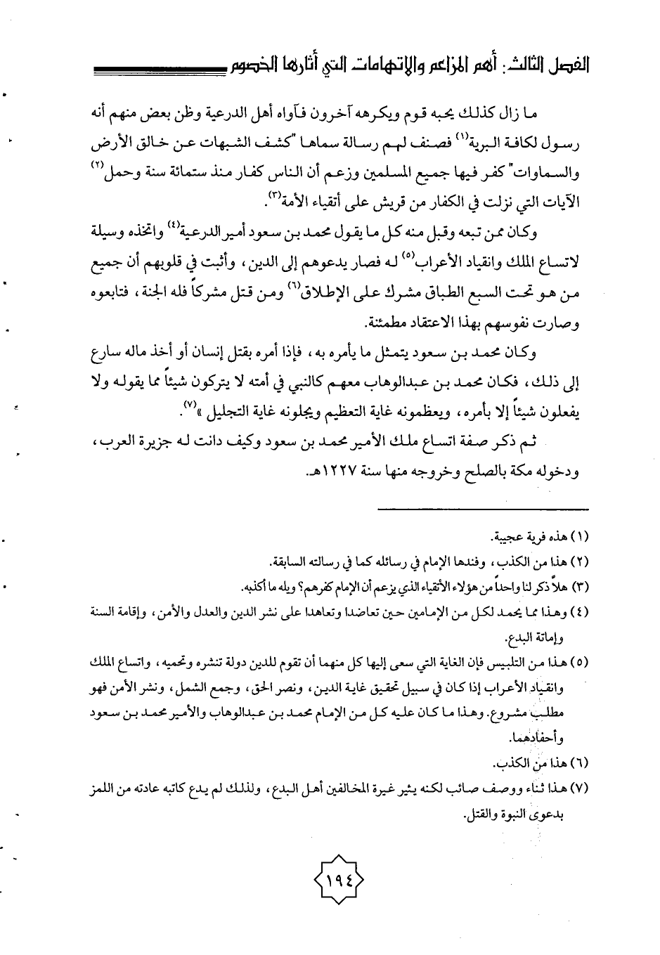 (¬5) هذا من التلبيس فإن الغاية التي سعى إليها كل منهما أن تقوم للدين دولة تنشره وتحميه، واتساع الملك وانقياد الأعراب إذا كان في سبيل تحقيق غاية الدين، ونصر الحق، وجمع الشمل، ونشر الأمن فهو مطلب مشروع. وهذا ما كان عليه كل من الإمام محمد بن عبد الوهاب والأمير محمد بن سعود وأحفادهما.
