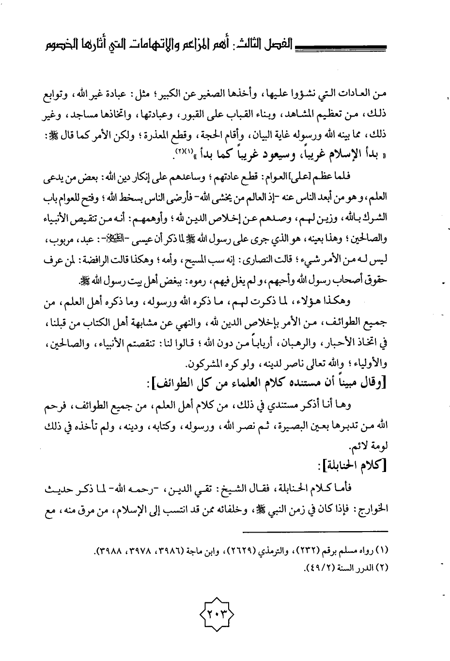 [كلام الحنابلة] : فأما كلام الحنابلة، فقال الشيخ: تقي الدين، - رحمه الله - لما ذكر حديث الخوارج: فإذا كان في زمن النبي صلى الله عليه وسلم، وخلفائه ممن قد انتسب إلى الإسلام، من مرق منه، مع