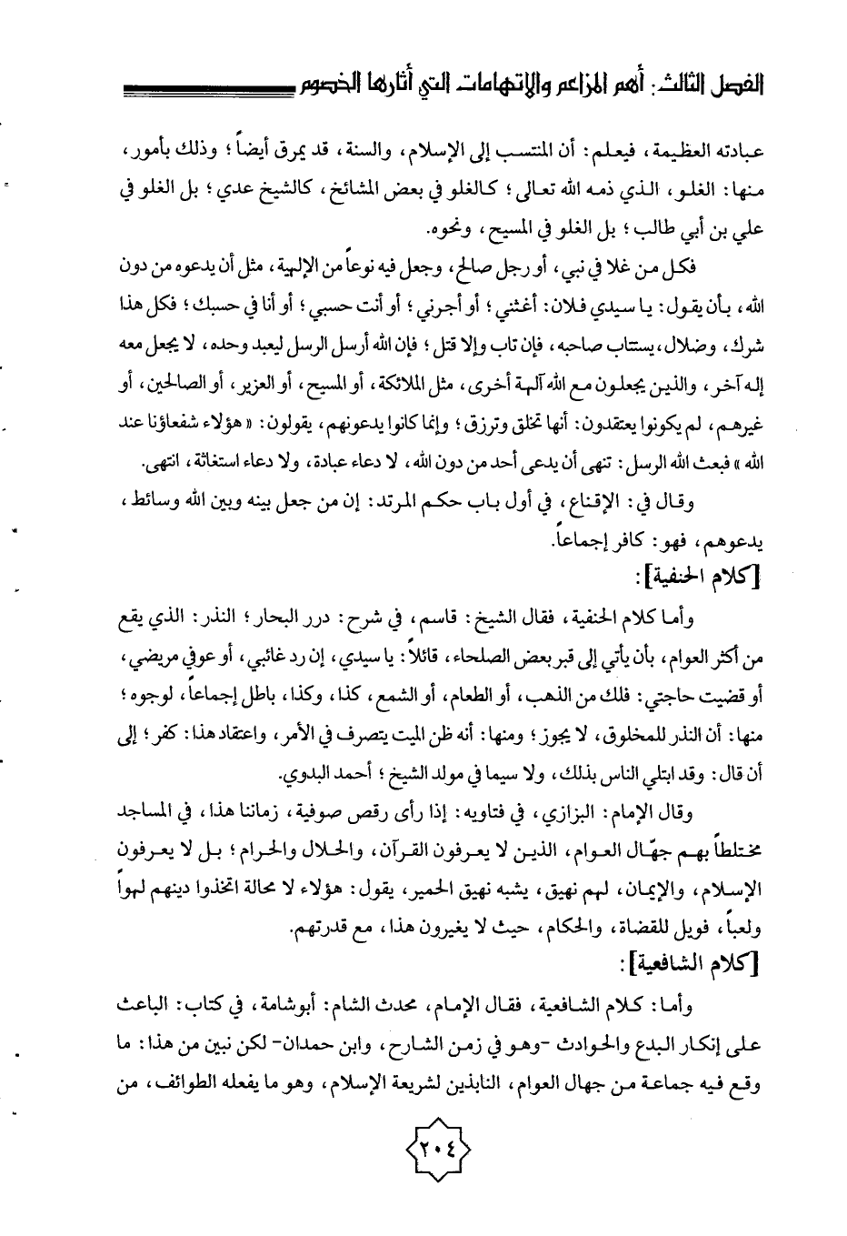 [كلام الحنفية] : وأما كلام الحنفية، فقال الشيخ: قاسم، في شرح: درر البحار؛ النذر: الذي يقع من أكثر العوام، بأن يأتي إلى قبر بعض الصلحاء، قائلاً: يا سيدي، إن رد غائبي، أو عوفي مريضي، أو قضيت حاجتي: فلك من الذهب، أو الطعام، أو الشمع، كذا، وكذا، باطل إجماعاً، لوجوه؛ منها: أن النذر للمخلوق، لا يجوز؛ ومنها: أنه ظن الميت يتصرف في الأمر، واعتقاد هذا: كفر؛ إلى أن قال: وقد ابتلي الناس بذلك، ولا سيما في مولد الشيخ أحمد البدوي.