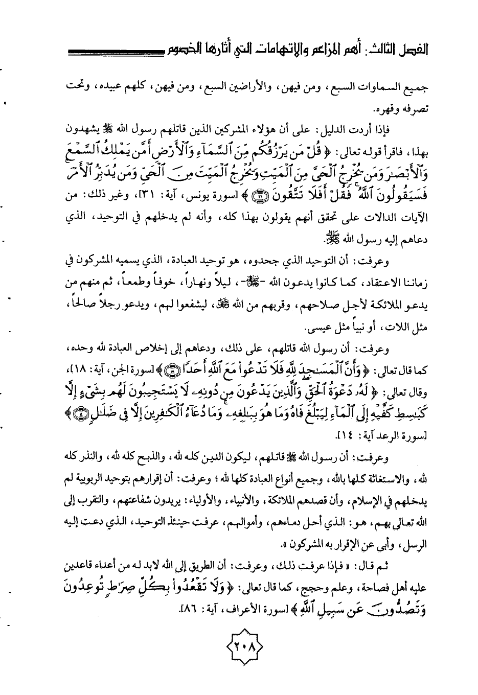 وعرفت: أن رسول الله قاتلهم، على ذلك، ودعاهم إلى إخلاص العبادة لله وحده، كما قال تعالى: {وَأَنَّ الْمَسَاجِدَ لِلَّهِ فَلَا تَدْعُوا مَعَ اللَّهِ أَحَدًا} [الجن: 18] [سورة الجن، آية: 18] ، وقال تعالى: {لَهُ دَعْوَةُ الْحَقِّ وَالَّذِينَ يَدْعُونَ مِنْ دُونِهِ لَا يَسْتَجِيبُونَ لَهُمْ بِشَيْءٍ إِلَّا كَبَاسِطِ كَفَّيْهِ إِلَى الْمَاءِ لِيَبْلُغَ فَاهُ وَمَا هُوَ بِبَالِغِهِ وَمَا دُعَاءُ الْكَافِرِينَ إِلَّا فِي ضَلَالٍ} [الرعد: 14] [سورة الرعد آية: 14] .