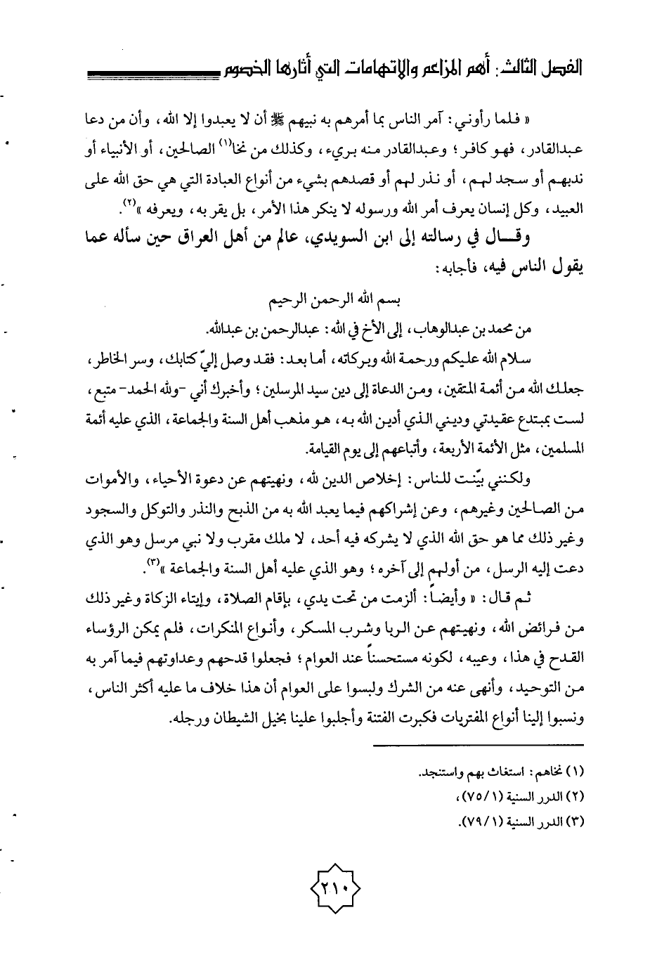 ولكنني بيّنت للناس: إخلاص الدين لله، ونهيتهم عن دعوة الأحياء، والأموات من الصالحين وغيرهم، وعن إشراكهم فيما يعبد الله به من الذبح والنذر والتوكل والسجود وغير ذلك مما هو حق الله الذي لا يشركه فيه أحد، لا ملك مقرب ولا نبي مرسل وهو الذي دعت إليه الرسل، من أولهم إلى آخره؛ وهو الذي عليه أهل السنة والجماعة» (¬3) .