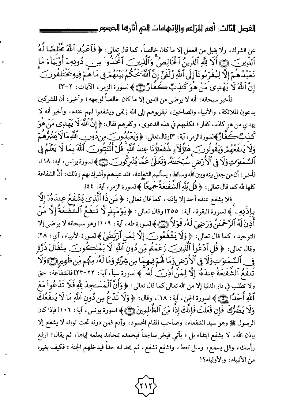 وصرف شيء من أنواع العبادة لغير الله: كصرف جميعها؛ لأنه سبحانه أغنى الشركاء عن الشرك، ولا يقبل من العمل إلا ما كان خالصًا، كما قال تعالى: {فَاعْبُدِ اللَّهَ مُخْلِصًا لَهُ الدِّينَ - أَلَا لِلَّهِ الدِّينُ الْخَالِصُ وَالَّذِينَ اتَّخَذُوا مِنْ دُونِهِ أَوْلِيَاءَ مَا نَعْبُدُهُمْ إِلَّا لِيُقَرِّبُونَا إِلَى اللَّهِ زُلْفَى إِنَّ اللَّهَ يَحْكُمُ بَيْنَهُمْ فِي مَا هُمْ فِيهِ يَخْتَلِفُونَ إِنَّ اللَّهَ لَا يَهْدِي مَنْ هُوَ كَاذِبٌ كَفَّارٌ} [الزمر: 2 - 3] [سورة الزمر، الآيات: 2 - 3] فأخبر سبحانه: أنه لا يرضى من الدين إلا ما كان خالصًا لوجهه؛ وأخبر: أن المشركين يدعون الملائكة، والأنبياء والصالحين، ليقربوهم إلى الله زلفى ويشفعوا لهم عنده، وأخبر أنه لا يهدي من هو كاذب كفار؛ فكذبهم في هذه الدعوى، وكفَّرهم فقال: {إِنَّ اللَّهَ لَا يَهْدِي مَنْ هُوَ كَاذِبٌ كَفَّارٌ} [الزمر: 3] [سورة الزمر، آية: 3] وقال تعالى: {وَيَعْبُدُونَ مِنْ دُونِ اللَّهِ مَا لَا يَضُرُّهُمْ وَلَا يَنْفَعُهُمْ وَيَقُولُونَ هَؤُلَاءِ شُفَعَاؤُنَا عِنْدَ اللَّهِ قُلْ أَتُنَبِّئُونَ اللَّهَ بِمَا لَا يَعْلَمُ فِي السَّمَاوَاتِ وَلَا فِي الْأَرْضِ سُبْحَانَهُ وَتَعَالَى عَمَّا يُشْرِكُونَ} [يونس: 18] [سورة يونس، آية: 18] ، فأخبر: أن من جعل بينه وبين الله وسائط، يسألهم الشفاعة، فقد عبدهم وأشرك بهم وذلك: أنَّ الشفاعة كلها لله كما قال تعالى: {قُلْ لِلَّهِ الشَّفَاعَةُ} [الزمر: 44] [سورة الزمر، آية: 44] .