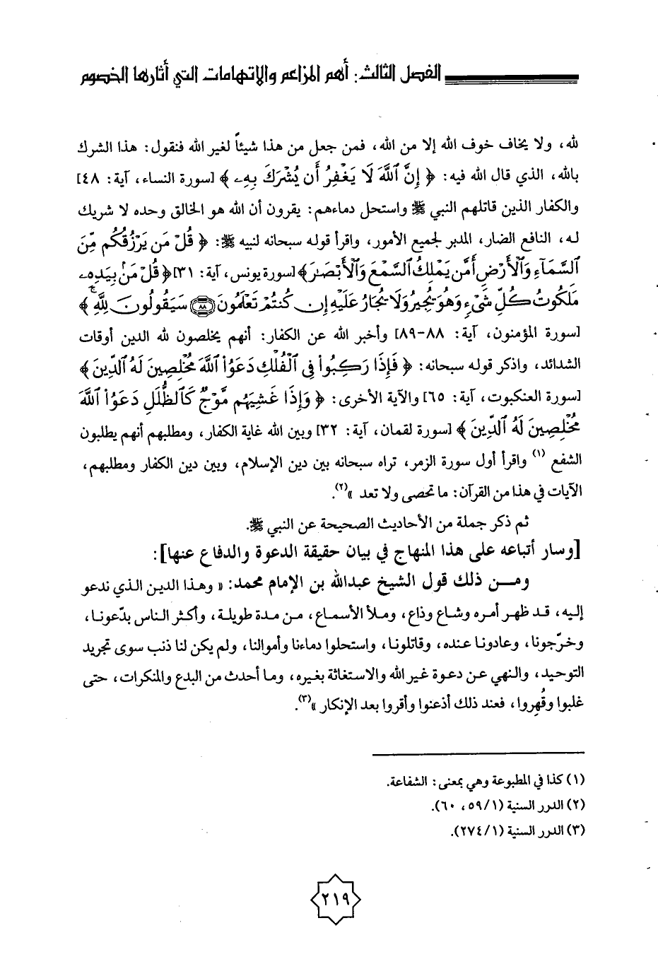 لله، ولا يخاف خوف الله إلا من الله، فمن جعل من هذا شيئًا لغير الله فنقول: هذا الشرك بالله، الذي قال الله فيه: {إِنَّ اللَّهَ لَا يَغْفِرُ أَنْ يُشْرَكَ بِهِ} [النساء: 48] [سورة النساء، آية: 48] والكفار الذين قاتلهم النبي صلى الله عليه وسلم واستحل دماءهم: يقرون أن الله هو الخالق وحده لا شريك له، النافع الضار، المدبر لجميع الأمور، واقرأ قوله سبحانه لنبيه صلى الله عليه وسلم: {قُلْ مَنْ يَرْزُقُكُمْ مِنَ السَّمَاءِ وَالْأَرْضِ أَمْ مَنْ يَمْلِكُ السَّمْعَ وَالْأَبْصَارَ} [يونس: 31] [سورة يونس، آية: 31] قُلْ مَنْ {بِيَدِهِ مَلَكُوتُ كُلِّ شَيْءٍ وَهُوَ يُجِيرُ وَلَا يُجَارُ عَلَيْهِ إِنْ كُنْتُمْ تَعْلَمُونَ - سَيَقُولُونَ لِلَّهِ} [المؤمنون: 88 - 89] [سورة المؤمنون، آية: 88 - 89] وأخبر الله عن الكفار: أنهم يخلصون لله الدين أوقات الشدائد، واذكر قوله سبحانه: {فَإِذَا رَكِبُوا فِي الْفُلْكِ دَعَوُا اللَّهَ مُخْلِصِينَ لَهُ الدِّينَ} [العنكبوت: 65] [سورة العنكبوت، آية: 65] والآية الأخرى: {وَإِذَا غَشِيَهُمْ مَوْجٌ كَالظُّلَلِ دَعَوُا اللَّهَ مُخْلِصِينَ لَهُ الدِّينَ} [لقمان: 32] [سورة لقمان، آية: 32] وبين الله غاية الكفار، ومطلبهم أنهم يطلبون الشفع (¬1) واقرأ أول سورة الزمر، تراه سبحانه بيَّن دين الإسلام، وبين دين الكفار ومطلبهم، الآيات في هذا من القرآن: ما تحصى ولا تعد» (¬2) .