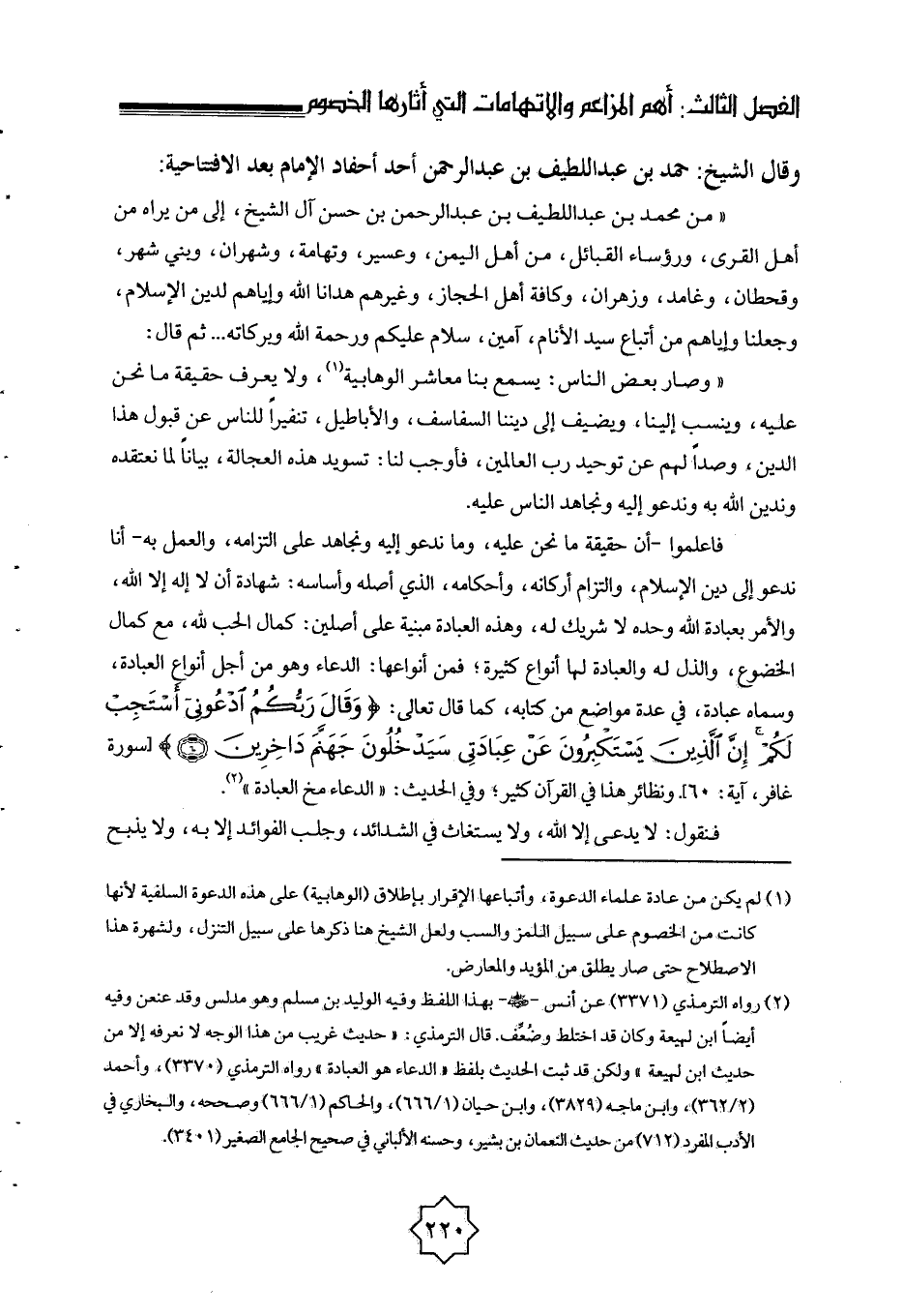 (¬1) لم يكن من عادة علماء الدعوة، وأتباعها الإقرار بإطلاق (الوهابية) على هذه الدعوة السلفية؛ لأنها كانت من الخصوم على سبيل اللمز والسب ولعل الشيخ هنا ذكرها على سبيل التنزل، ولشهرة هذا الاصطلاح حتى صار يطلق من المؤيد والمعارض.