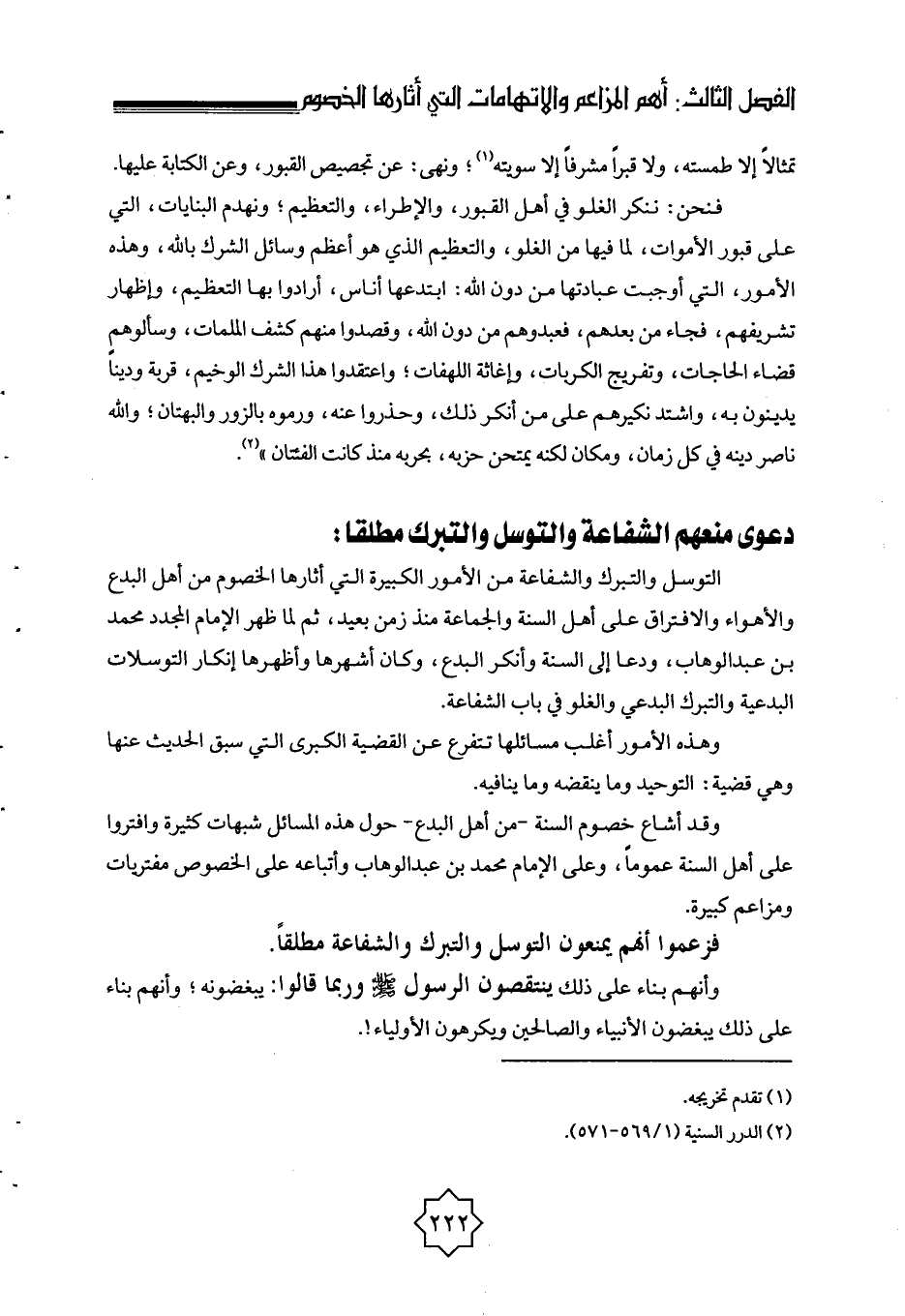 دعوى منعهم الشفاعة والتوسل والتبرك مطلقا: التوسل والتبرك والشفاعة من الأمور الكبيرة التي أثارها الخصوم من أهل البدع والأهواء والافتراق على أهل السنة والجماعة منذ زمن بعيد؛ ثم لما ظهر الإمام المجدد محمد بن عبد الوهاب، ودعا إلى السنة وأنكر البدع، وكان أشهرها وأظهرها إنكار التوسلات البدعية والتبرك البدعي والغلو في باب الشفاعة.
