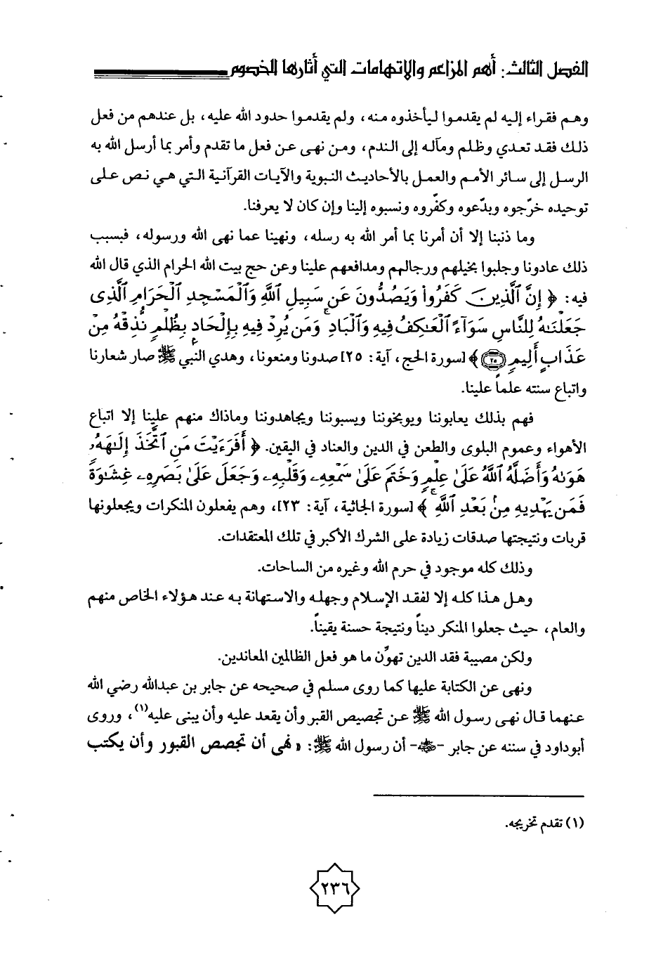 وما ذنبنا إلا أن أمرنا بما أمر الله به رسله، ونهينا عما نهى الله ورسوله، فبسبب ذلك عادونا وجلبوا بخيلهم ورجالهم ومدافعهم علينا، وعن حج بيت الله الحرام الذي قال الله فيه: {إِنَّ الَّذِينَ كَفَرُوا وَيَصُدُّونَ عَنْ سَبِيلِ اللَّهِ وَالْمَسْجِدِ الْحَرَامِ الَّذِي جَعَلْنَاهُ لِلنَّاسِ سَوَاءً الْعَاكِفُ فِيهِ وَالْبَادِي وَمَنْ يُرِدْ فِيهِ بِإِلْحَادٍ بِظُلْمٍ نُذِقْهُ مِنْ عَذَابٍ أَلِيمٍ} [الحج: 25] [سورة الحج، آية: 25] صدونا ومنعونا، وهدي النبي صلى الله عليه وسلم صار شعارنا واتباع سنته علمًا علينا.