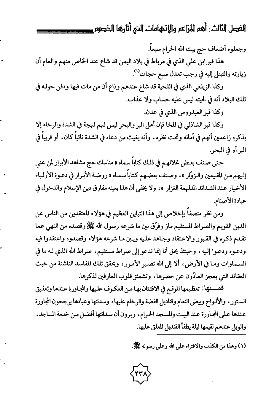 حتى صنَّف بعض غلاتهم في ذلك كتابًا سماه «مناسك حج مشاهد الأبرار لمن عني إليهم من المقيمين والزوّار» ، وصنف بعضهم كتابًا سماه «روضة الأبرار في دعوة الأولياء الأخيار عند الشدائد المدلهمة الغزار» ، ولا يخفى أن هذا بعينه مفارق دين الإسلام والدخول في عبادة الأصنام.