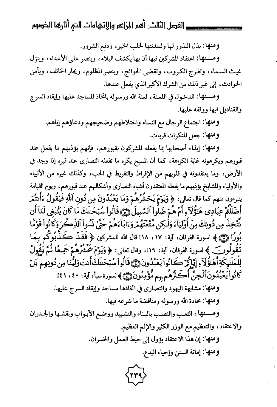ومنها: إيذاء أصحابها بما يفعله المشركون بقبورهم، فإنهم يؤذيهم ما يُفعل عند قبورهم ويكرهونه غاية الكراهة، كما أن المسيح يكره ما تفعله النصارى عند قبره إذا وجد في الأرض، وما يعتقدونه في قلوبهم من الإفراط والتفريط في الحب، وكذلك غيره من الأنبياء والأولياء والمشايخ يؤذيهم ما يفعله المعتقدون أشباه النصارى وأشكالهم عند قبورهم، ويوم القيامة يتبرءون منهم كما قال تعالى: {وَيَوْمَ يَحْشُرُهُمْ وَمَا يَعْبُدُونَ مِنْ دُونِ اللَّهِ فَيَقُولُ أَأَنْتُمْ أَضْلَلْتُمْ عِبَادِي هَؤُلَاءِ أَمْ هُمْ ضَلُّوا السَّبِيلَ - قَالُوا سُبْحَانَكَ مَا كَانَ يَنْبَغِي لَنَا أَنْ نَتَّخِذَ مِنْ دُونِكَ مِنْ أَوْلِيَاءَ وَلَكِنْ مَتَّعْتَهُمْ وَآبَاءَهُمْ حَتَّى نَسُوا الذِّكْرَ وَكَانُوا قَوْمًا بُورًا} [الفرقان: 17 - 18] [سورة الفرقان، آية: 17، 18] قال الله للمشركين {فَقَدْ كَذَّبُوكُمْ بِمَا تَقُولُونَ} [الفرقان: 19] [سورة الفرقان، آية: 19] ، وقال تعالى: {وَيَوْمَ يَحْشُرُهُمْ جَمِيعًا ثُمَّ يَقُولُ لِلْمَلَائِكَةِ أَهَؤُلَاءِ إِيَّاكُمْ كَانُوا يَعْبُدُونَ - قَالُوا سُبْحَانَكَ أَنْتَ وَلِيُّنَا مِنْ دُونِهِمْ بَلْ كَانُوا يَعْبُدُونَ الْجِنَّ أَكْثَرُهُمْ بِهِمْ مُؤْمِنُونَ} [سبأ: 40 - 41] [سورة سبأ، آية: 40، 41] .