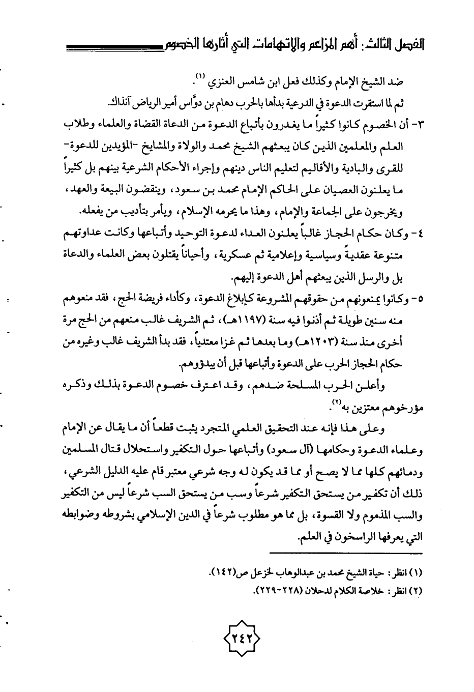 وعلى هذا فإنه عند التحقيق العلمي المتجرد يثبت قطعًا أن ما يقال عن الإمام وعلماء الدعوة وحكامها (آل سعود) وأتباعها حول التكفير واستحلال قتال المسلمين ودمائهم كلها مما لا يصح أو مما قد يكون له وجه شرعي معتبر قام عليه الدليل الشرعي، ذلك أن تكفير من يستحق التكفير شرعًا وسب من يستحق السب شرعًا ليس من التكفير والسب المذموم ولا القسوة، بل مما هو مطلوب شرعًا في الدين الإسلامي بشروطه وضوابطه التي يعرفها الراسخون في العلم.