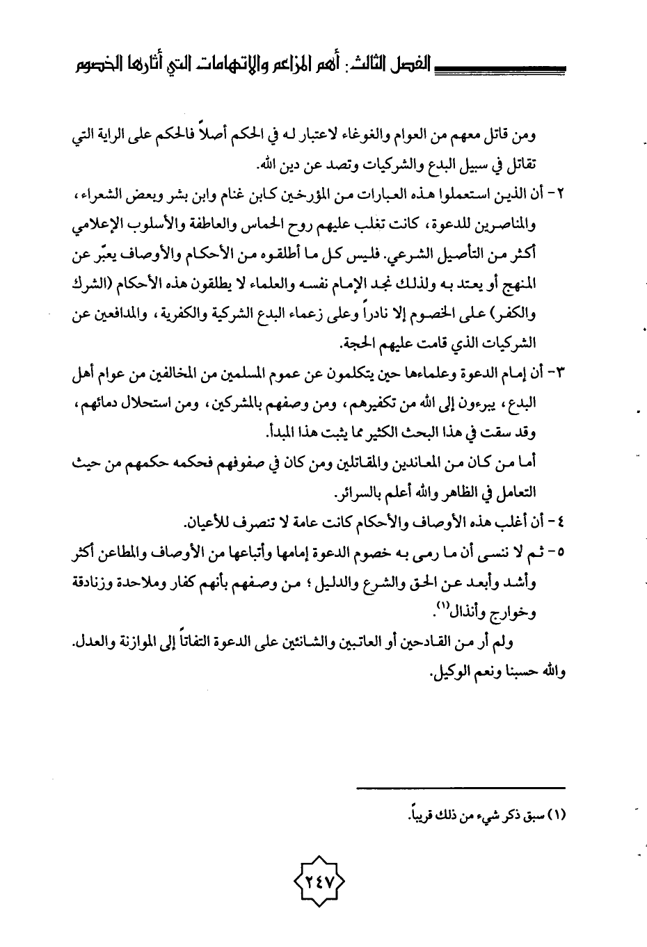 2 - أن الذين استعملوا هذه العبارات من المؤرخين كابن غنام وابن بشر وبعض الشعراء، والمناصرين للدعوة، كانت تغلب عليهم روح الحماس والعاطفة والأسلوب الإعلامي أكثر من التأصيل الشرعي. فليس كل ما أطلقوه من الأحكام والأوصاف يعبّر عن المنهج أو يعتد به ولذلك نجد الإمام نفسه والعلماء لا يطلقون هذه الأحكام (الشرك والكفر) على الخصوم إلا نادرًا وعلى زعماء البدع الشركية والكفرية، والمدافعين عن الشركيات الذي قامت عليهم الحجة.