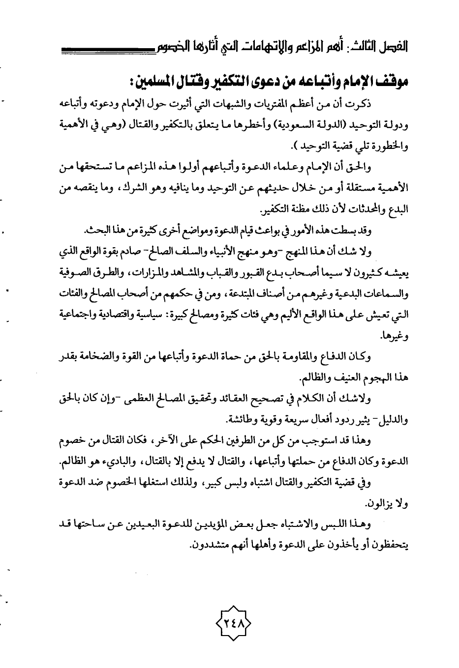 موقف الإمام وأتباعه من دعوى التكفير وقتال المسلمين: ذكرتُ أن من أعظم المفتريات والشبهات التي أثيرت حول الإمام ودعوته وأتباعه ودولة التوحيد (الدولة السعودية) وأخطرها ما يتعلق بالتكفير والقتال (وهي في الأهمية والخطورة تلي قضية التوحيد) .