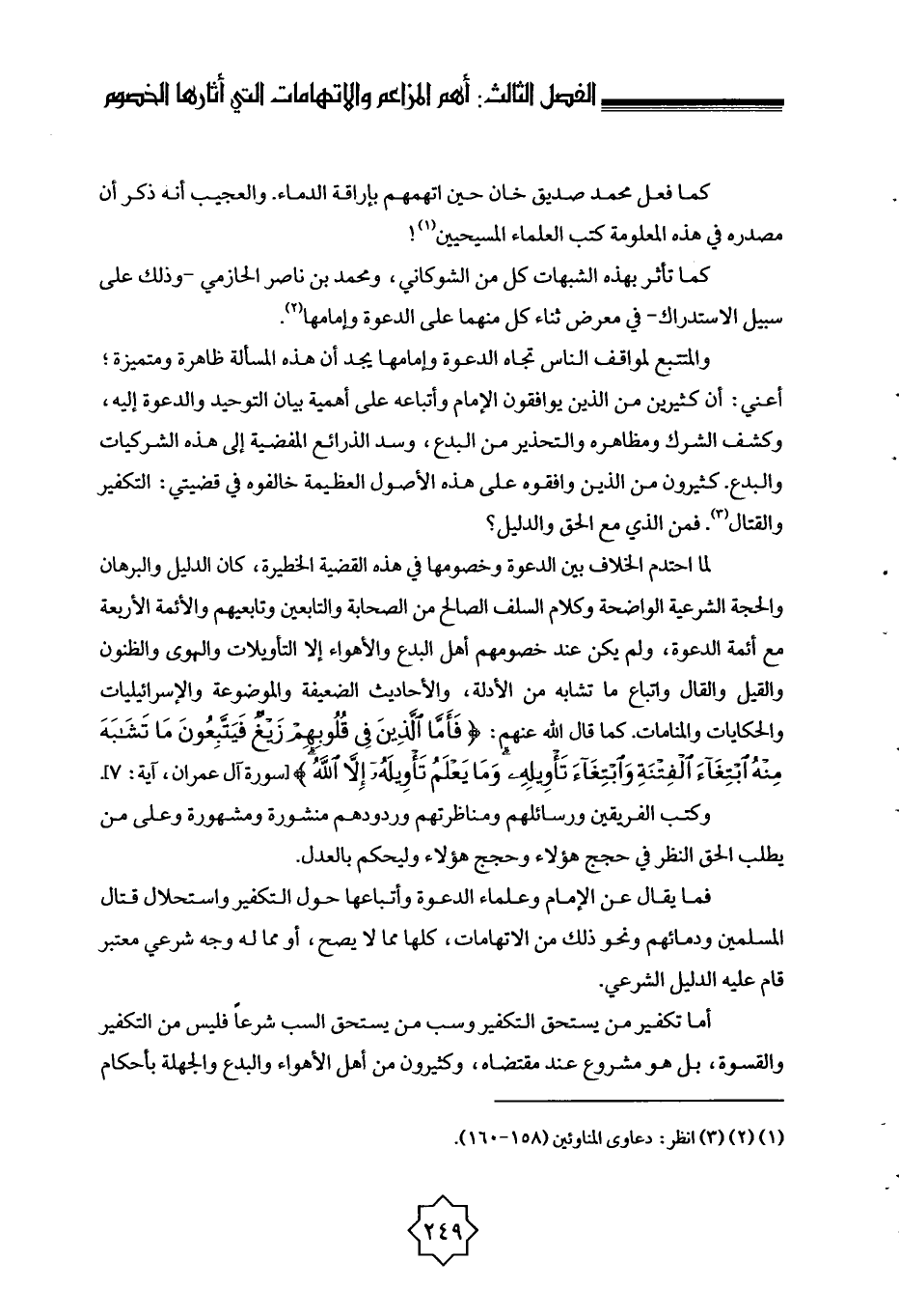والمتتبع لمواقف الناس تجاه الدعوة وإمامها يجد أن هذه المسألة ظاهرة ومتميزة؛ أعني: أن كثيرين من الذين يوافقون الإمام وأتباعه على أهمية بيان التوحيد والدعوة إليه، وكشف الشرك ومظاهره والتحذير من البدع، وسد الذرائع المفضية إلى هذه الشركيات والبدع. كثيرون من الذين وافقوه على هذه الأصول العظيمة خالفوه في قضيتي: التكفير والقتال (¬3) . فمن الذي مع الحق والدليل؟ لما احتدم الخلاف بين الدعوة وخصومها في هذه القضية الخطيرة، كان الدليل والبرهان والحجة الشرعية الواضحة وكلام السلف الصالح من الصحابة والتابعين وتابعيهم والأئمة الأربعة مع أئمة الدعوة، ولم يكن عند خصومهم أهل البدع والأهواء إلا التأويلات والهوى والظنون والقيل والقال واتباع ما تشابه من الأدلة، والأحاديث الضعيفة والموضوعة والإسرائيليات والحكايات والمنامات. كما قال الله عنهم: {فَأَمَّا الَّذِينَ فِي قُلُوبِهِمْ زَيْغٌ فَيَتَّبِعُونَ مَا تَشَابَهَ مِنْهُ ابْتِغَاءَ الْفِتْنَةِ وَابْتِغَاءَ تَأْوِيلِهِ وَمَا يَعْلَمُ تَأْوِيلَهُ إِلَّا اللَّهُ} [آل عمران: 7] [سورة آل عمران، آية: 7] .
