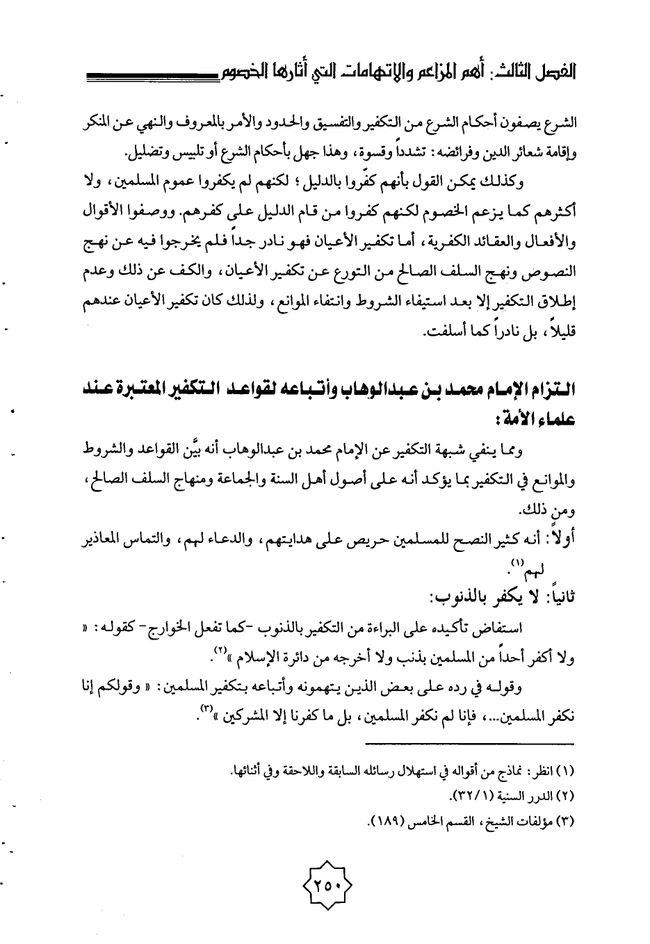 التزام الإمام محمد بن عبد الوهاب وأتباعه لقواعد التكفير المعتبرة عند علماء الأمة: ومما ينفي شبهة التكفير عن الإمام محمد بن عبد الوهاب أنه بيَّن القواعد والشروط والموانع في التكفير بما يؤكد أنه على أصول أهل السنة والجماعة ومنهاج السلف الصالح، ومن ذلك.