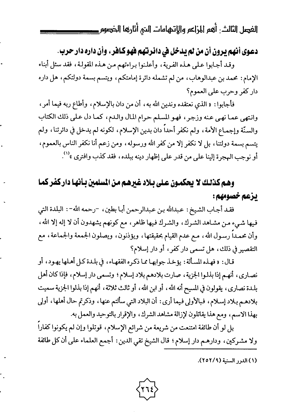 دعوى أنهم يرون أن من لم يدخل في دائرتهم فهو كافر، وأن داره دار حرب. وقد أجابوا على هذه الفرية، وأعلنوا براءتهم من هذه المقولة، فقد سئل أبناء الإمام: محمد بن عبد الوهاب، من لم تشمله دائرة إمامتكم، ويتسم بسمة دولتكم، هل داره دار كفر وحرب على العموم؟ فأجابوا: «الذي نعتقده وندين الله به، أن من دان بالإسلام، وأطاع ربه فيما أمر، وانتهى عما نهى عنه وزجر، فهو المسلم حرام المال والدم، كما دل على ذلك الكتاب والسنّة وإجماع الأمة، ولم نكفر أحدًا دان بدين الإسلام؛ لكونه لم يدخل في دائرتنا، ولم يتسم بسمة دولتنا، بل لا نكفر إلا من كفر الله ورسوله، ومن زعم أنا نكفر الناس بالعموم، أو نوجب الهجرة إلينا على من قدر على إظهار دينه ببلده، فقد كذب وافترى» (¬1) .