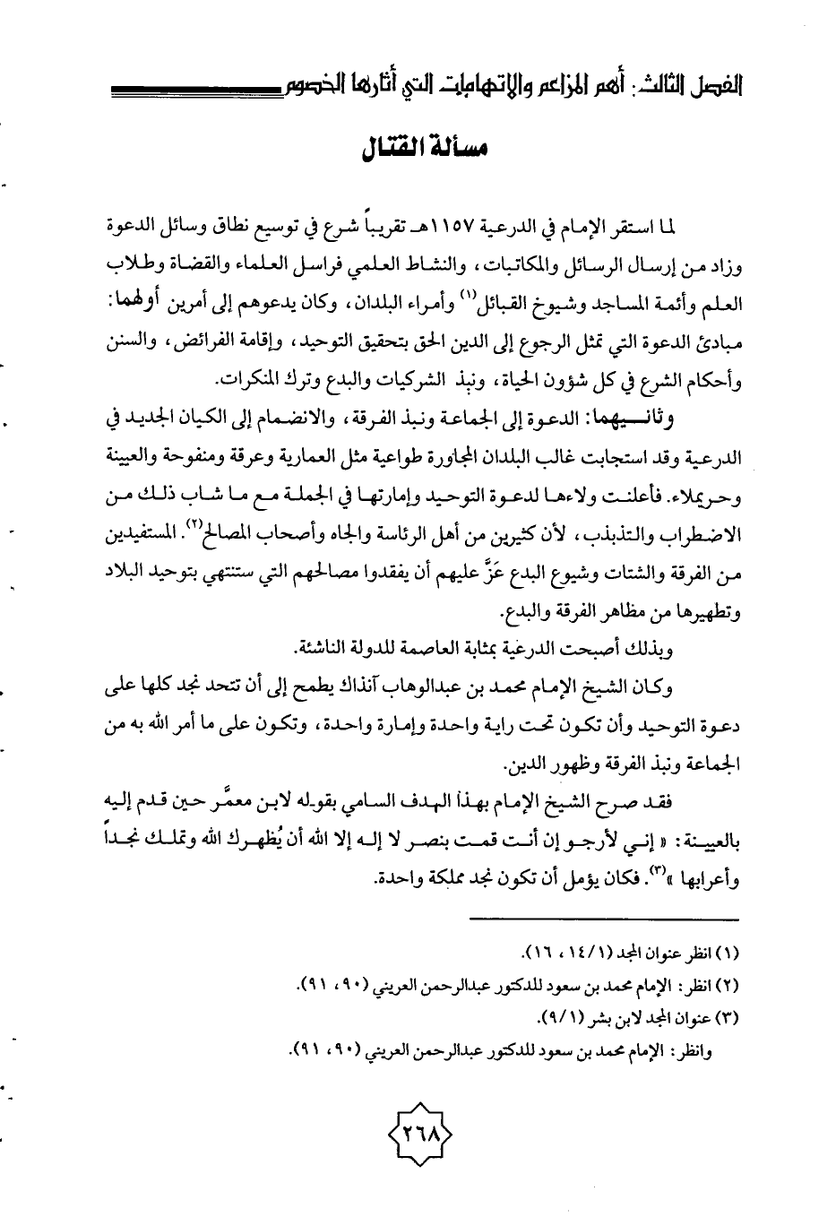 مسألة القتال لما استقر الإمام في الدرعية 1157هـ تقريبًا شرع في توسيع نطاق وسائل الدعوة، وزاد من إرسال الرسائل والمكاتبات، والنشاط العلمي فراسل العلماء والقضاة وطلاب العلم وأئمة المساجد وشيوخ القبائل (¬1) وأمراء البلدان، وكان يدعوهم إلى أمرين أولهما: مبادئ الدعوة التي تمثل الرجوع إلى الدين الحق بتحقيق التوحيد، وإقامة الفرائض، والسنن وأحكام الشرع في كل شؤون الحياة، ونبذ الشركيات والبدع وترك المنكرات.