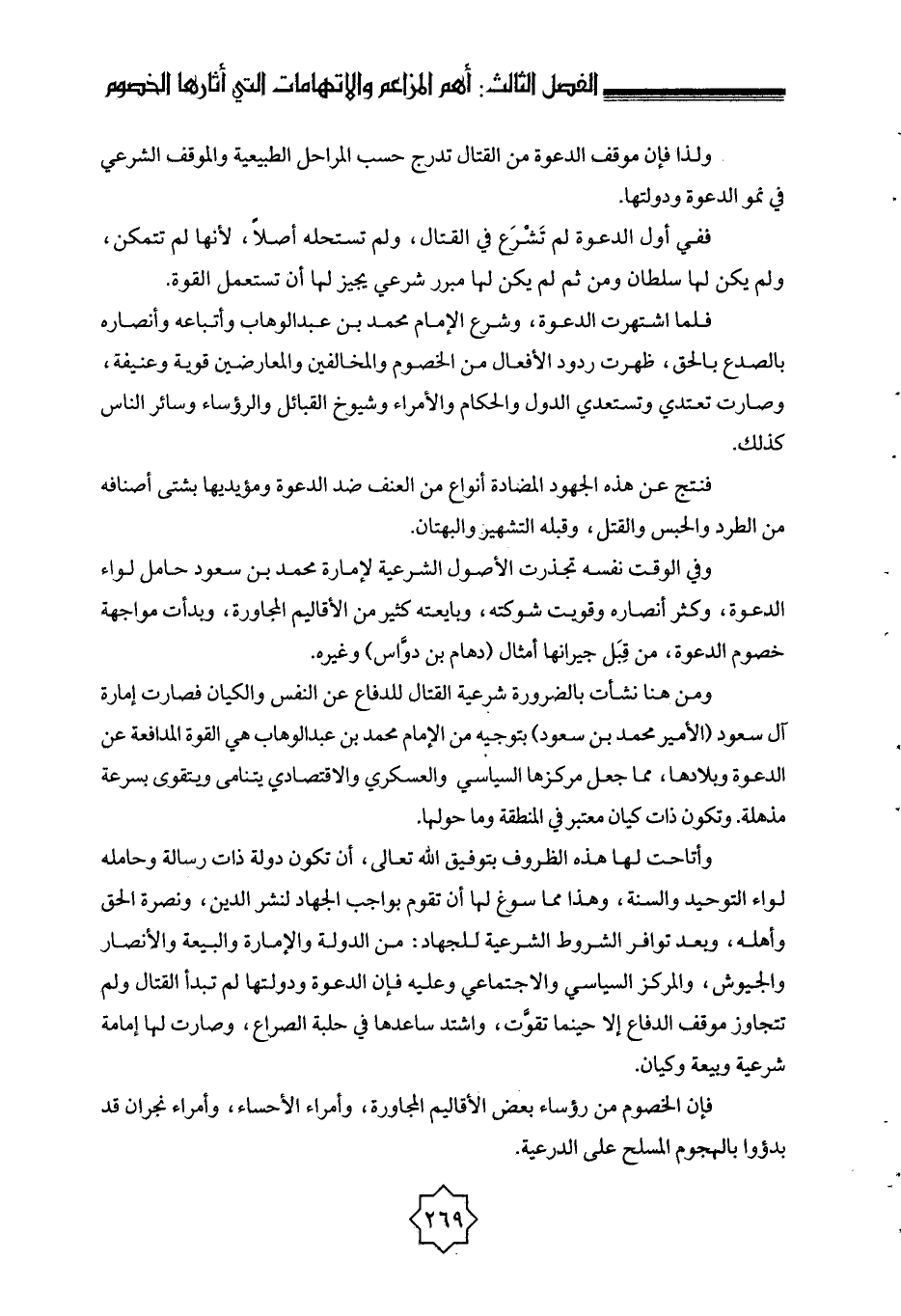 وأتاحت لها هذه الظروف بتوفيق الله تعالى، أن تكون دولة ذات رسالة وحاملة لواء التوحيد والسنة، وهذا مما سوغ لها أن تقوم بواجب الجهاد لنشر الدين، ونصرة الحق وأهله، وبعد توافر الشروط الشرعية للجهاد: من الدولة والإمارة والبيعة والأنصار والجيوش، والمركز السياسي والاجتماعي، وعليه فإن الدعوة ودولتها لم تبدأ القتال ولم تتجاوز موقف الدفاع إلا حينما تقوَّت، واشتد ساعدها في حلبة الصراع، وصارت لها إمامة شرعية وبيعة وكيان.