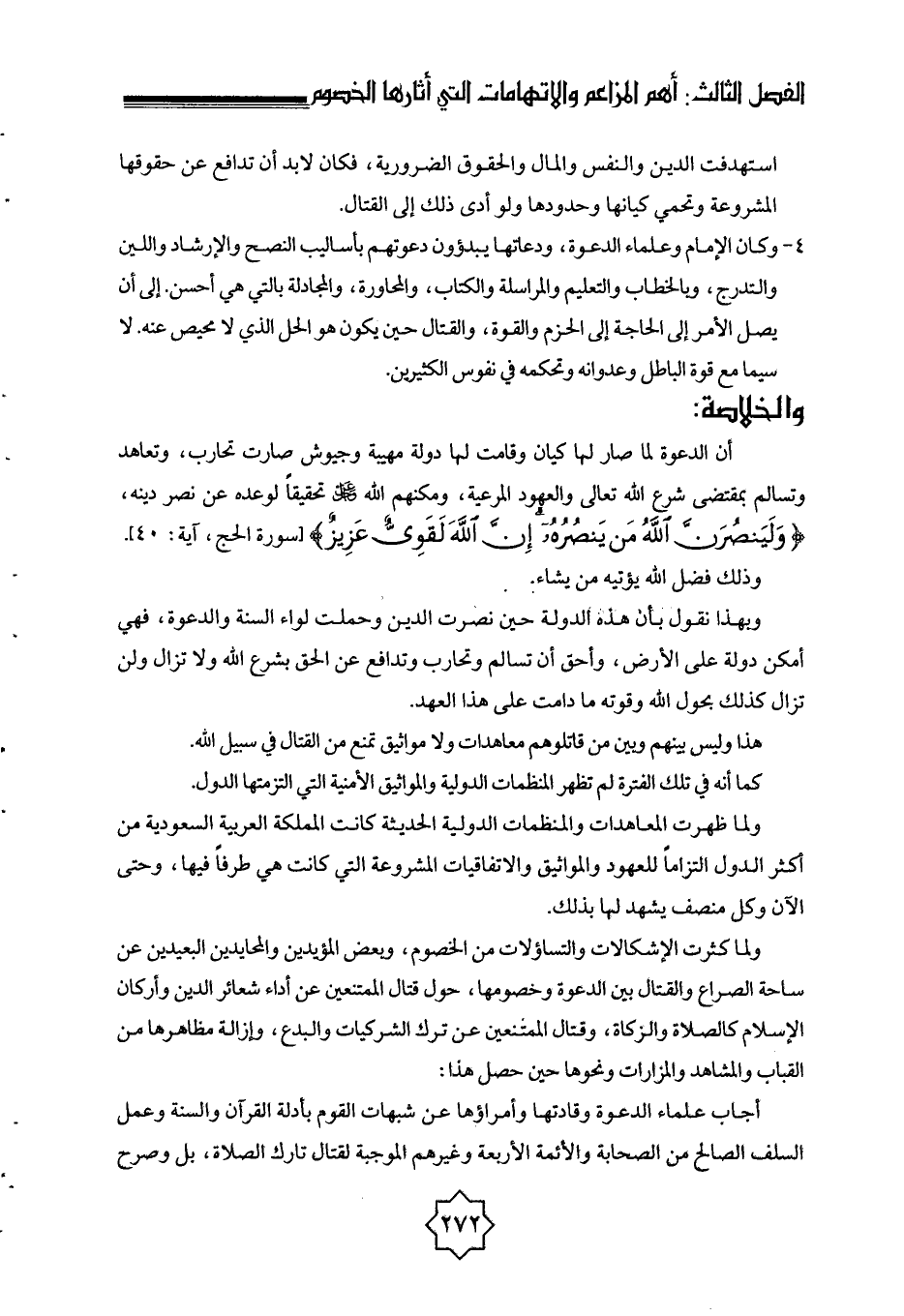 أن الدعوة لمَّا صار لها كيان وقامت لها دولة مهيبة وجيوش صارت تحارب، وتعاهد وتسالم بمقتضى شرع الله تعالى والعهود المرعية، ومكَّنهم الله عز وجل تحقيقًا لوعده عن نصر دينه، {وَلَيَنْصُرَنَّ اللَّهُ مَنْ يَنْصُرُهُ إِنَّ اللَّهَ لَقَوِيٌّ عَزِيزٌ} [الحج: 40] [سورة الحج، آية: 40] .