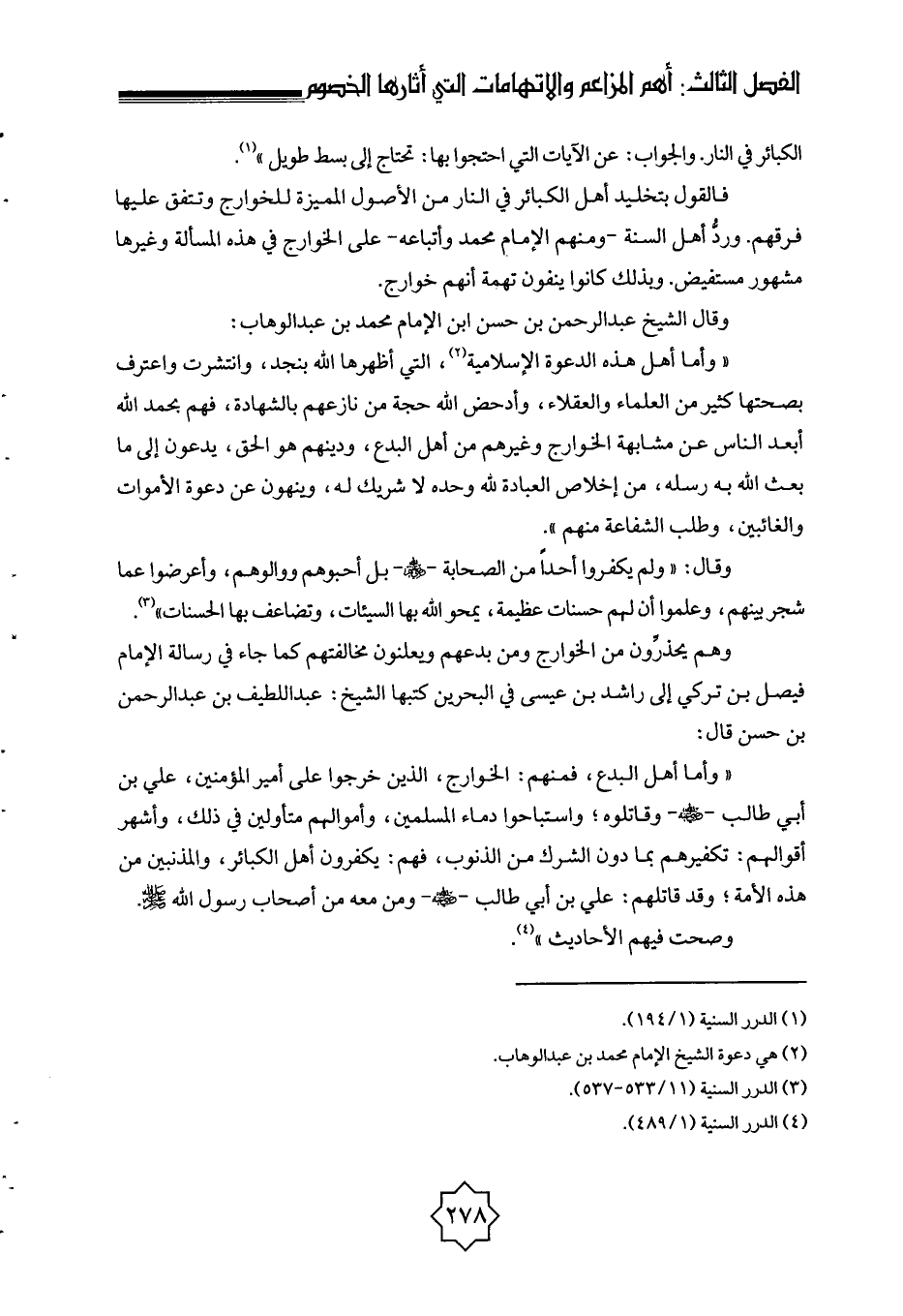 فالقول بتخليد أهل الكبائر في النار من الأصول المميزة للخوارج وتتفق عليها فرقهم. وردُّ أهل السنة - ومنهم الإمام محمد وأتباعه - على الخوارج في هذه المسألة وغيرها مشهور مستفيض. وبذلك كانوا ينفون تهمة أنهم خوارج.