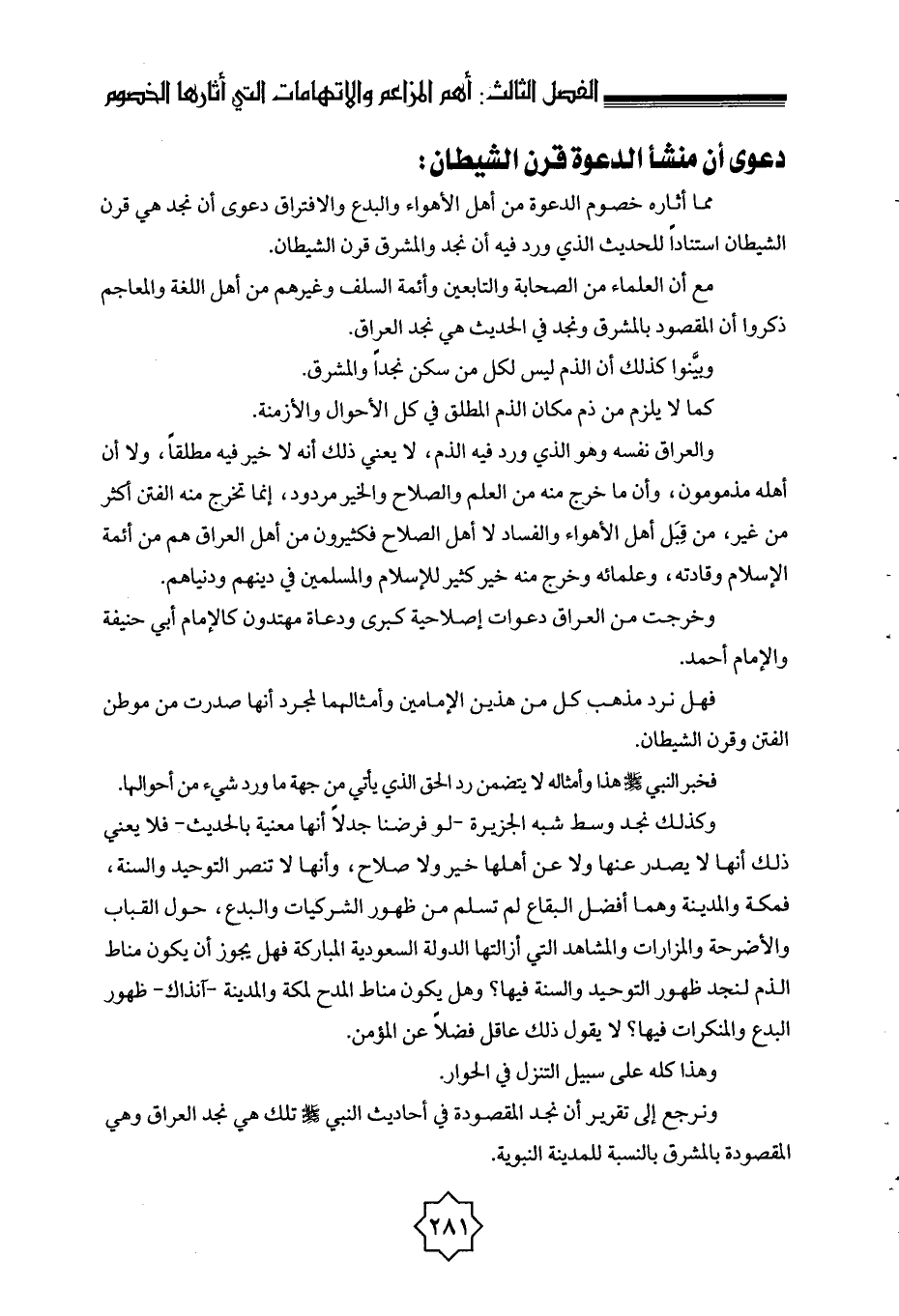 مما أثاره خصوم الدعوة من أهل الأهواء والبدع والافتراق دعوى أن نجد هي قرن الشيطان استنادًا للحديث الذي ورد فيه أن نجد والمشرق قرن الشيطان.