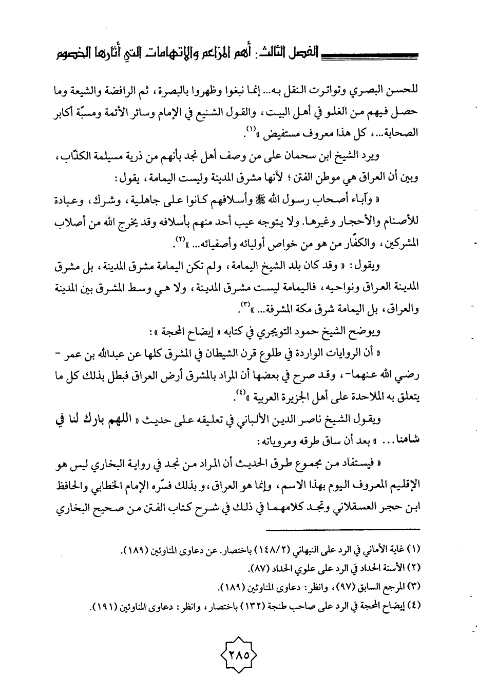 ويرد الشيخ ابن سحمان على من وصف أهل نجد بأنهم من ذرية مسيلمة الكذّاب، وبين أن العراق هي موطن الفتن؛ لأنها مشرق المدينة وليست اليمامة، يقول: «وآباء أصحاب رسول الله صلى الله عليه وسلم وأسلافهم كانوا على جاهلية، وشرك، وعبادة للأصنام والأحجار وغيرها. ولا يتوجه عيب أحد منهم بأسلافه وقد يُخرج الله من أصلاب المشركين، والكفّار من هو من خواص أوليائه وأصفيائه. . .» (¬2) .