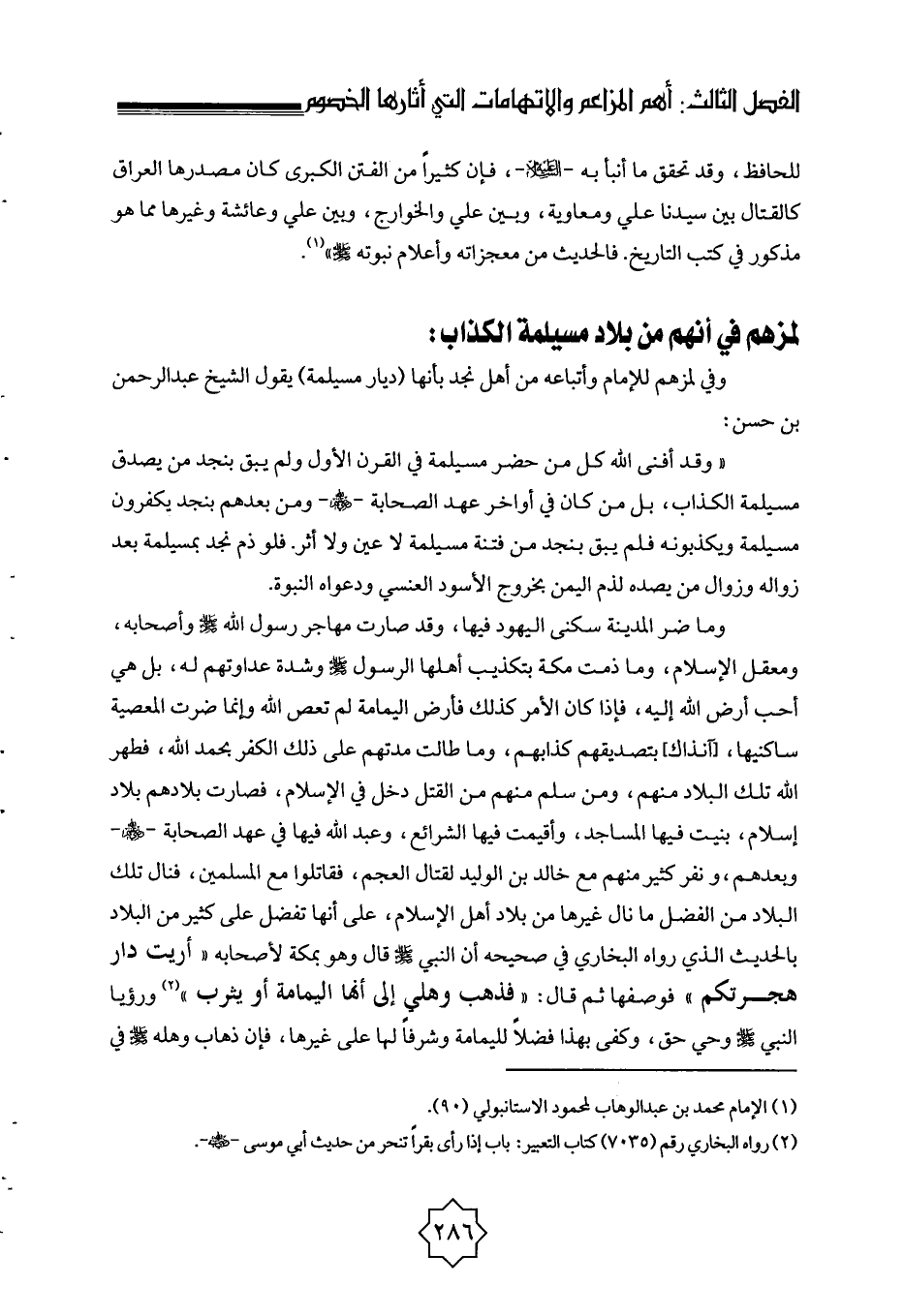 لمزهم في أنهم من بلاد مسيلمة الكذاب: وفي لمزهم للإمام وأتباعه من أهل نجد بأنها (ديار مسيلمة) يقول الشيخ عبد الرحمن بن حسن: «وقد أفنى الله كل من حضر مسيلمة في القرن الأول ولم يبق بنجد من يصدق مسيلمة الكذاب، بل من كان في أواخر عهد الصحابة - رضي الله عنه - ومن بعدهم بنجد يُكَفِّرون مسيلمة ويكذِّبُونه فلم يبق بنجد من فتنة مسيلمة لا عين ولا أثر. فلو ذُمَّ نجدٌ بمسيلمة بعد زواله وزوال من يصده لذُم اليمن بخروج الأسود العنسي ودعواه النبوة.