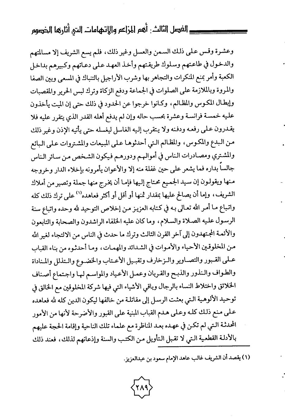 فيكون الشخص من سائر الناس جالسا بداره فما يشعر على حين غفلة منه إلا والأعوان يأمرونه بإخلاء الدار وخروجه منها، ويقولون: إن سيد الجميع محتاج إليها، فإما أن يخرج منها جملة وتصير من أملاك الشريف، وإما أن يصالح عليها بمقدار ثمنها أو أقل أو أكثر فعاهده (¬1) على ترك ذلك كله، واتباع ما أمر الله تعالى به في كتابه العزيز من إخلاص التوحيد لله وحده، واتباع سنة الرسول عليه الصلاة والسلام، وما كان عليه الخلفاء الراشدون والصحابة والتابعون والأئمة المجتهدون إلى آخر القرن الثالث، وترك ما حدث في الناس من الالتجاء لغير الله من المخلوقين الأحياء والأموات في الشدائد والمهمات، وما أحدثوه من بناء القباب على القبور والتصاوير والزخارف، وتقبيل الأعتاب والخضوع والتذلل والمناداة والطواف، والنذور والذبح والقربان وعمل الأعياد والمواسم لها، واجتماع أصناف الخلائق، واختلاط النساء بالرجال، وباقي الأشياء التي فيها شركة المخلوقين مع الخالق في توحيد الألوهية التي بعثت الرسل إلى مقاتلة من خالفها ليكون الدين كله لله.