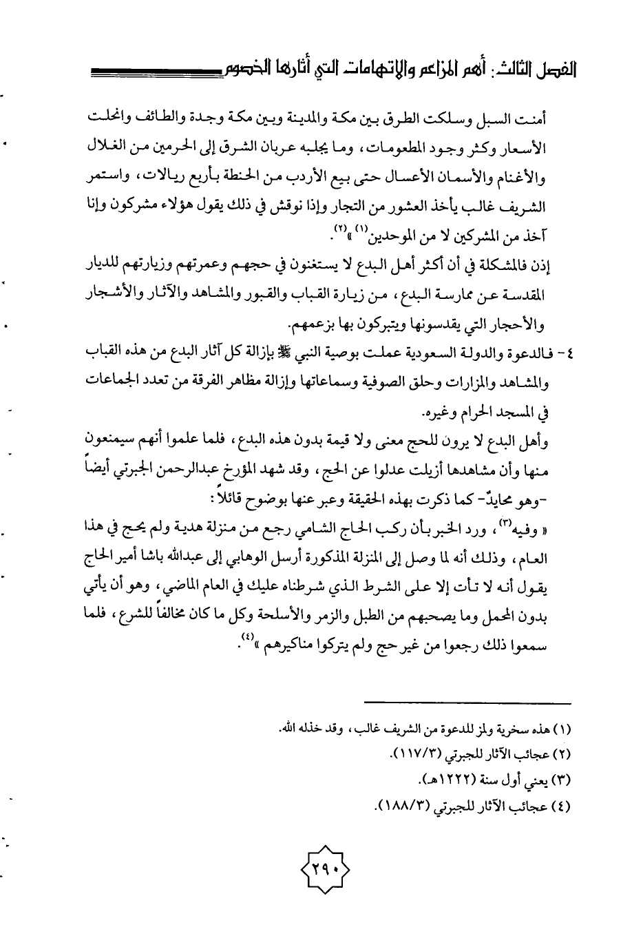 وأهل البدع لا يرون للحج معنى ولا قيمة بدون هذه البدع، فلما علموا أنهم سيمنعون منها وأن مشاهدها أزيلت عدلوا عن الحج، وقد شهد المؤرخ عبد الرحمن الجبرتي أيضا - وهو محايد - كما ذكرت بهذه الحقيقة، وعبر عنها بوضوح قائلا: