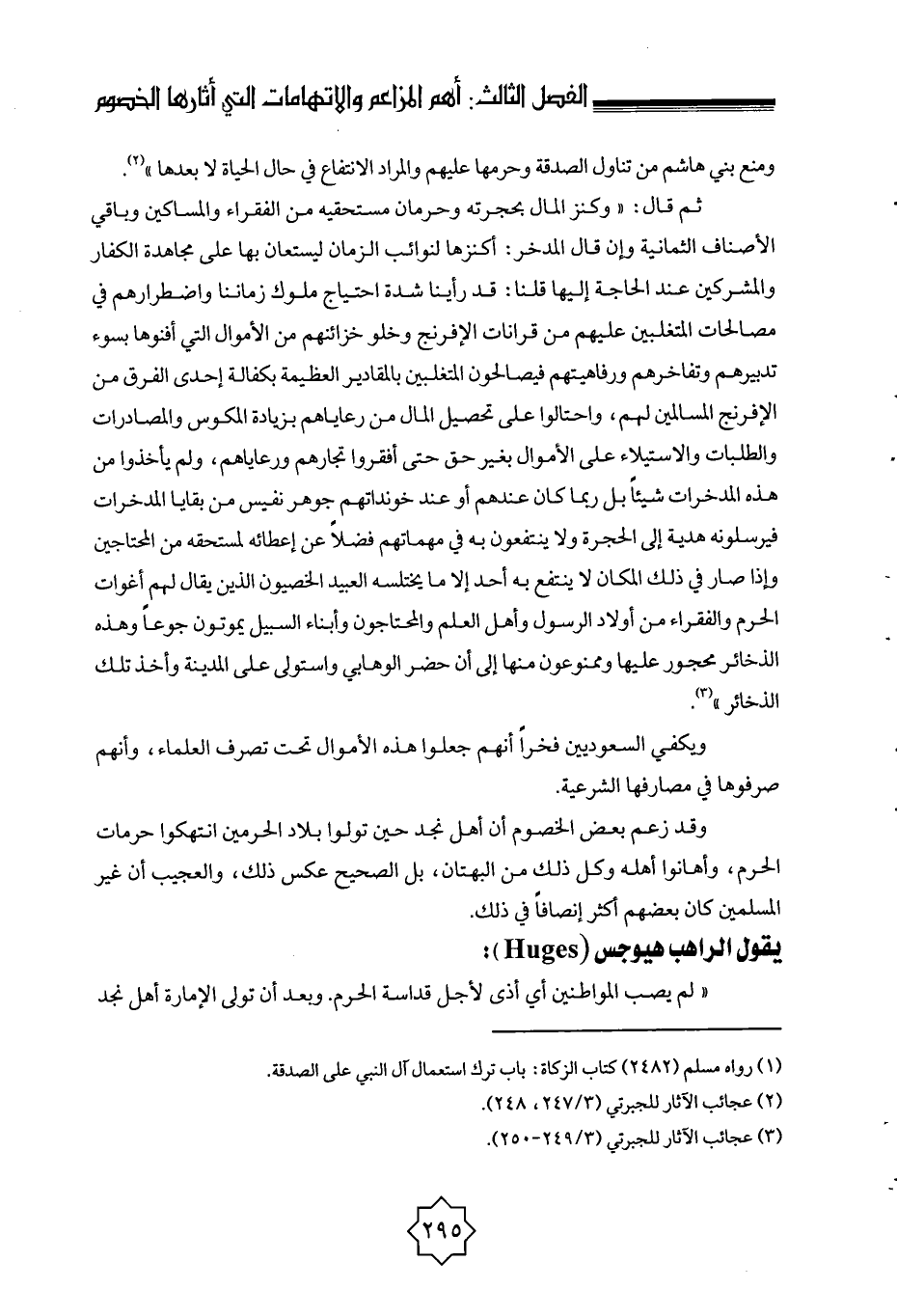ثم قال: " وكنز المال بحجرته وحرمان مستحقيه من الفقراء والمساكين وباقي الأصناف الثمانية، وإن قال المدخر: أكنزها لنوائب الزمان ليستعان بها على مجاهدة الكفار والمشركين عند الحاجة إليها، قلنا: قد رأينا شدة احتياج ملوك زماننا واضطرارهم في مصالحات المتغلبين عليهم من قرانات الإفرنج وخلو خزائنهم من الأموال التي أفنوها بسوء تدبيرهم وتفاخرهم ورفاهيتهم، فيصالحون المتغلبين بالمقادير العظيمة بكفالة إحدى الفرق من الإفرنج المسالمين لهم، واحتالوا على تحصيل المال من رعاياهم بزيادة المكوس والمصادرات والطلبات، والاستيلاء على الأموال بغير حق، حتى أفقروا تجارهم ورعاياهم، ولم يأخذوا من هذه المدخرات شيئا، بل ربما كان عندهم أو عند خونداتهم جوهر نفيس من بقايا المدخرات فيرسلونه هدية إلى الحجرة، ولا ينتفعون به في مهماتهم، فضلا عن إعطائه لمستحقه من المحتاجين، وإذا صار في ذلك المكان لا ينتفع به أحد إلا ما يختلسه العبيد الخصيون الذين يقال لهم أغوات الحرم، والفقراء من أولاد الرسول وأهل العلم والمحتاجون وأبناء السبيل يموتون جوعا، وهذه الذخائر محجور عليها وممنوعون منها إلى أن حضر الوهابي، واستولى على المدينة، وأخذ تلك الذخائر " (¬2) .