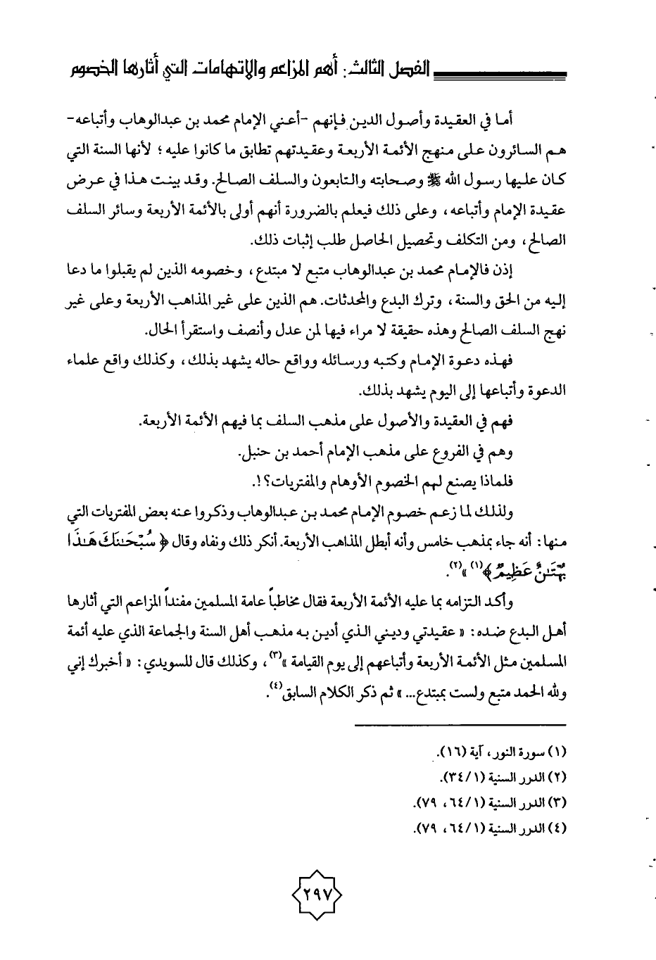 ولذلك لما زعم خصوم الإمام محمد بن عبد الوهاب وذكروا عنه بعض المفتريات التي منها: أنه جاء بمذهب خامس، وأنه أبطل المذاهب الأربعة، أنكر ذلك ونفاه، وقال: {سُبْحَانَكَ هَذَا بُهْتَانٌ عَظِيمٌ} [النور: 16] (¬1) " (¬2) .